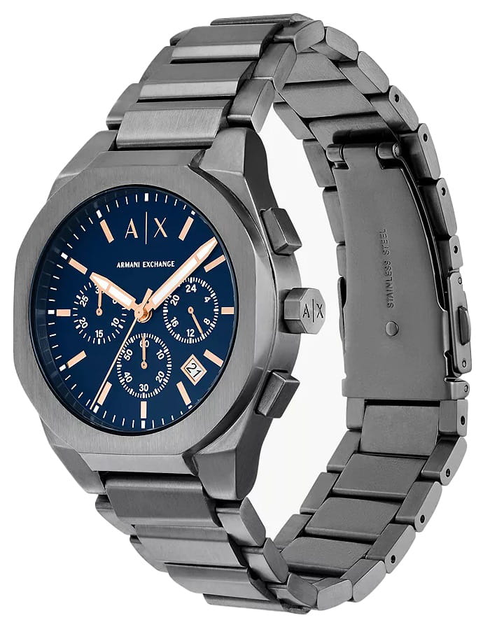 Мужские наручные часы-хронографХронографФункция позволяет измерять отрезки времени с особой точностью: часы, минуты, секунды. Верным признаком хронографа является наличие на циферблате 3 дополнительных окошек-счётчиков. Armani Exchange Rafael AX4182 сочетают в себе практичность и стильный дизайн, идеально подходя как для повседневной носки, так и для занятий спортом. Часы оснащены круглым корпусом из нержавеющей стали с IP-покрытиемIP-покрытиеМетод ионного напыления. Демонстрирует повышенную устойчивость к истиранию, окислению и химическим веществам. Под воздействием высокого давления и температуры около 1500°C молекулы металла надёжно соединяются с частицами корпуса часов. серого цвета, диаметром 42 мм. Особенностью модели является наличие окошка даты, расположенного между отметками 4 и 5 часов, что добавляет функциональности аксессуару. Стрелки обладают люминесцентным покрытиемЛюминесцентное покрытиеПозволяет считывать показания времени в темноте. Производители наносят на стрелки, часовые индексы, безель или поверхность циферблата светонакопительный состав, дающий холодное свечение., которое светится в темноте после зарядки на свету, обеспечивая отличную видимость в любых условиях. Защиту циферблата обеспечивают минеральное стеклоМинеральное стеклоМинеральное стекло представляет собой искусственно выращенный минерал кварца. Такое стекло отличается особой устойчивостью к повреждениям и царапинам. Уступает по некоторым качествам сапфировому стеклу., которое устойчиво к царапинам и сохраняет прозрачность на протяжении всего срока службы. Стальной браслет на раскладной застёжкеРаскладная застёжкаТакой тип застёжки используется только на браслетах из металла. Она никогда не раскрывается полностью, происходит разделение на 2 и более частей. Раскладывающая застёжка снизит вероятность потери часов к минимуму. не только комфортен в ношении, но и практичен благодаря своей прочности. Модель обладает водозащитой до 50 метров, что позволит защитить корпус от случайных брызг или капель дождя.