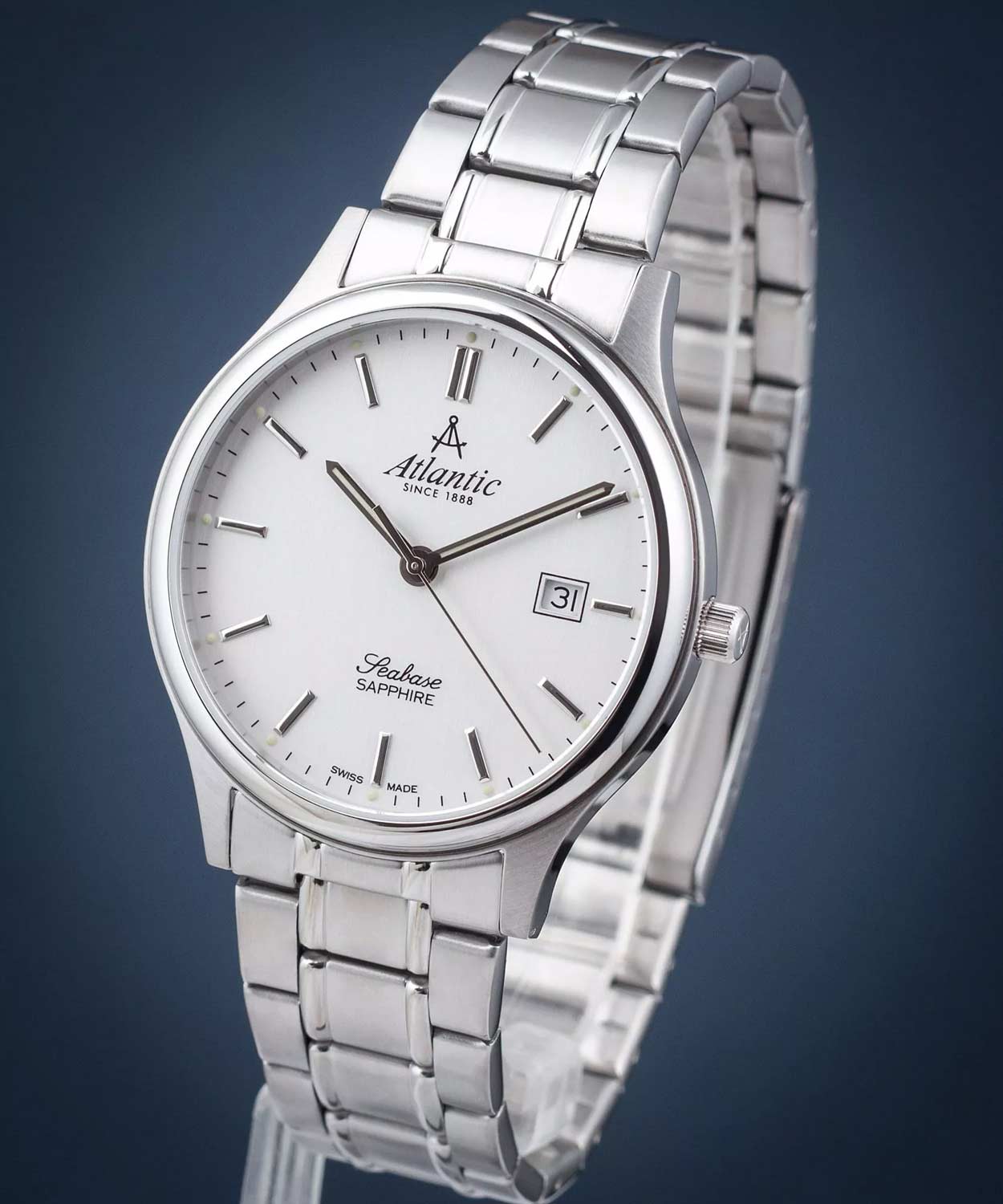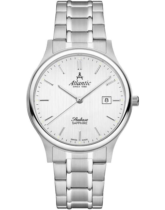 Мужские кварцевые швейцарские часы Atlantic Seapair 60348.41.21, механизм с высокой точностью. Циферблат часов с сапфировым стекломСапфировое стеклоПрочный и надёжный материал из кристалла сапфира синтетического происхождения, характеризующийся особой твёрдостью и устойчивостью к царапинам и повреждениям., устойчивым к появлению царапин и обладающее высокой прозрачностью. Класс водозащиты: 50 метров, позволит защитить корпус от случайных брызг или капель дождя. Корпус часов изготовлен из нержавеющей стали. Стальной браслет на раскладной застёжкеРаскладная застёжкаТакой тип застёжки используется только на браслетах из металла. Она никогда не раскрывается полностью, происходит разделение на 2 и более частей. Раскладывающая застёжка снизит вероятность потери часов к минимуму.. Окошко даты находится в положении 3 часа.