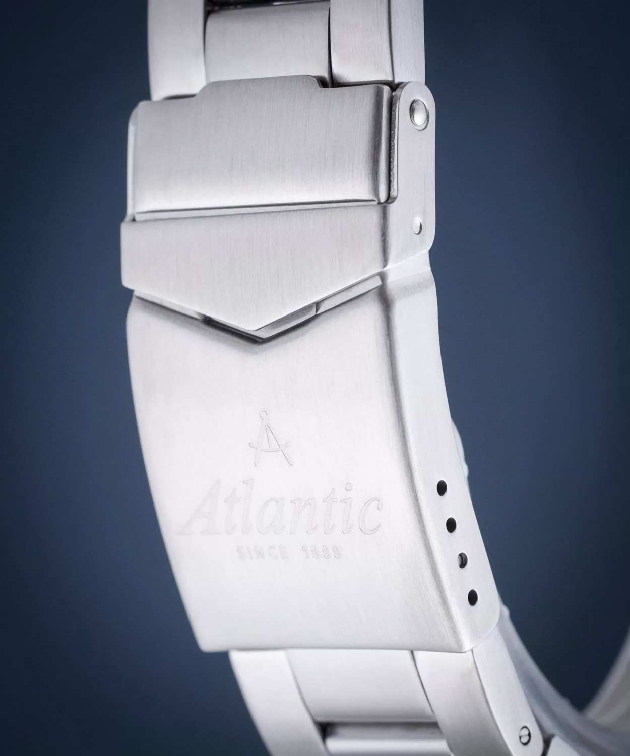 Мужские кварцевые швейцарские часы Atlantic Seaflight 70356.41.65, механизм с высокой точностью. Циферблат часов с сапфировым стекломСапфировое стеклоПрочный и надёжный материал из кристалла сапфира синтетического происхождения, характеризующийся особой твёрдостью и устойчивостью к царапинам и повреждениям., устойчивым к появлению царапин и обладающее высокой прозрачностью. Класс водозащиты: 50 метров, позволит защитить корпус от случайных брызг или капель дождя. Корпус часов изготовлен из нержавеющей стали. Стальной браслет на раскладной застёжкеРаскладная застёжкаТакой тип застёжки используется только на браслетах из металла. Она никогда не раскрывается полностью, происходит разделение на 2 и более частей. Раскладывающая застёжка снизит вероятность потери часов к минимуму.. Окошко даты находится в положении 3 часа.