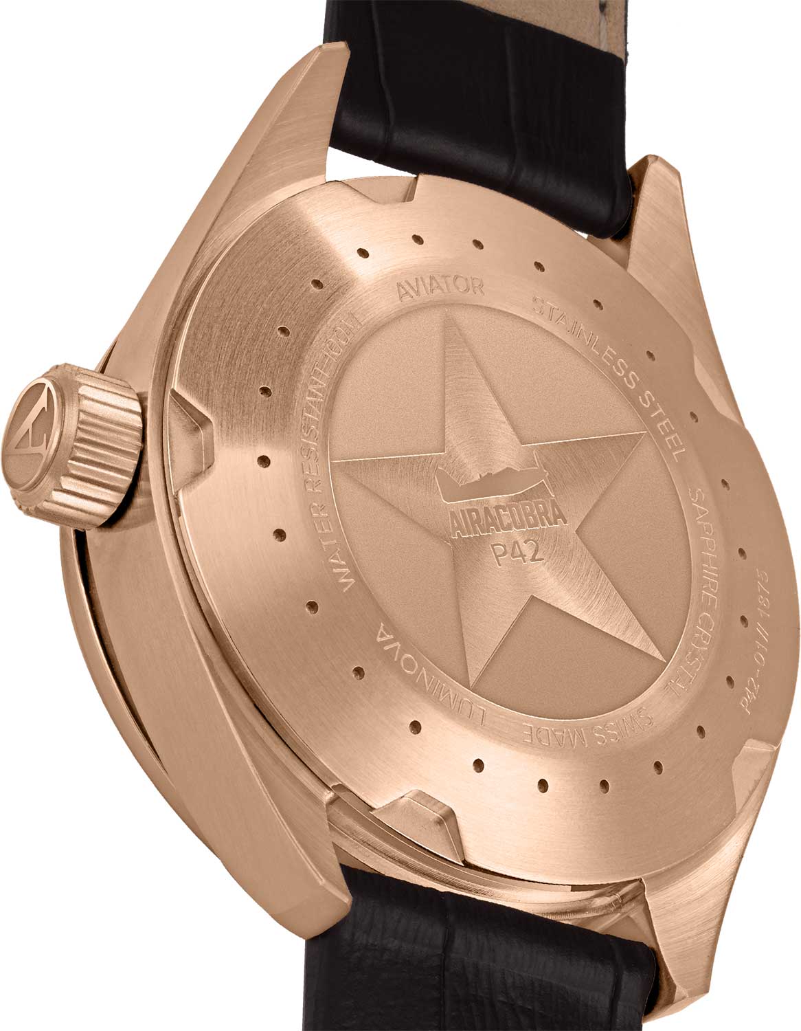 Aviator Airacobra V.1.22.2.151.4 — швейцарские часы в классике авиадизайна, сочетающие безупречную читаемость и высокую надёжность. Корпус диаметром 42 мм выполнен из нержавеющей стали с PVD-покрытиемPVDУльтратонкое покрытие наносится в технике вакуумного напыления, сочетает в себе нитрид титана особой прочности со слоем золота или оксида хрома. Несёт в себе декоративную или защитную функцию. — это придаёт модели благородный и уверенный облик.