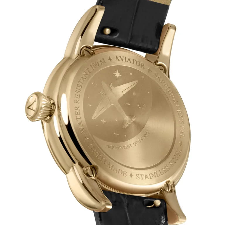 Aviator Douglas MoonFlight V.1.33.1.344.4— элегантные дамские швейцарские часы с утончённой авиационной эстетикой. Корпус 36 мм из нержавеющей стали 316L с PVD-покрытиемPVDУльтратонкое покрытие наносится в технике вакуумного напыления, сочетает в себе нитрид титана особой прочности со слоем золота или оксида хрома. Несёт в себе декоративную или защитную функцию. обладает компактными пропорциями и удобным профилем. Циферблат в стиле Art Deco украшает усложнение фаз Луны в верхней половине, обрамлённой тонким кольцом облаков. Отмечено окно даты в положении «6 часов». Стрелки обработаны люминесцентным покрытиемЛюминесцентное покрытиеПозволяет считывать показания времени в темноте. Производители наносят на стрелки, часовые индексы, безель или поверхность циферблата светонакопительный состав, дающий холодное свечение. Superluminova — для уверенного считывания в темноте. Поверхность защищена сапфировым стекломСапфировое стеклоПрочный и надёжный материал из кристалла сапфира синтетического происхождения, характеризующийся особой твёрдостью и устойчивостью к царапинам и повреждениям. с антибликовым покрытиемАнтибликовое покрытиеСлой оксида металла в 0,13-0,3 микрон, благодаря которому стекло часов не бликует и не отражает свет. Антибликовое покрытие уменьшает отражение света в 10 раз, обеспечивая отличную читаемость показателей циферблата.. Сердце модели — швейцарский кварцевый механизм Ronda 708 с функцией отображения лунных фаз. Водозащита до 100 метров создают надёжную основу для эксплуатации. Кожаный ремень со стандартной застежкой сочетает в себе комфорт, элегантность и практичность. Aviator Douglas MoonFlight — это гармоничное сочетание авиационного наследия, женской элегантности и технической изысканности, воплощённое в элегантном и функциональном аксессуаре. Лимитированная серия.