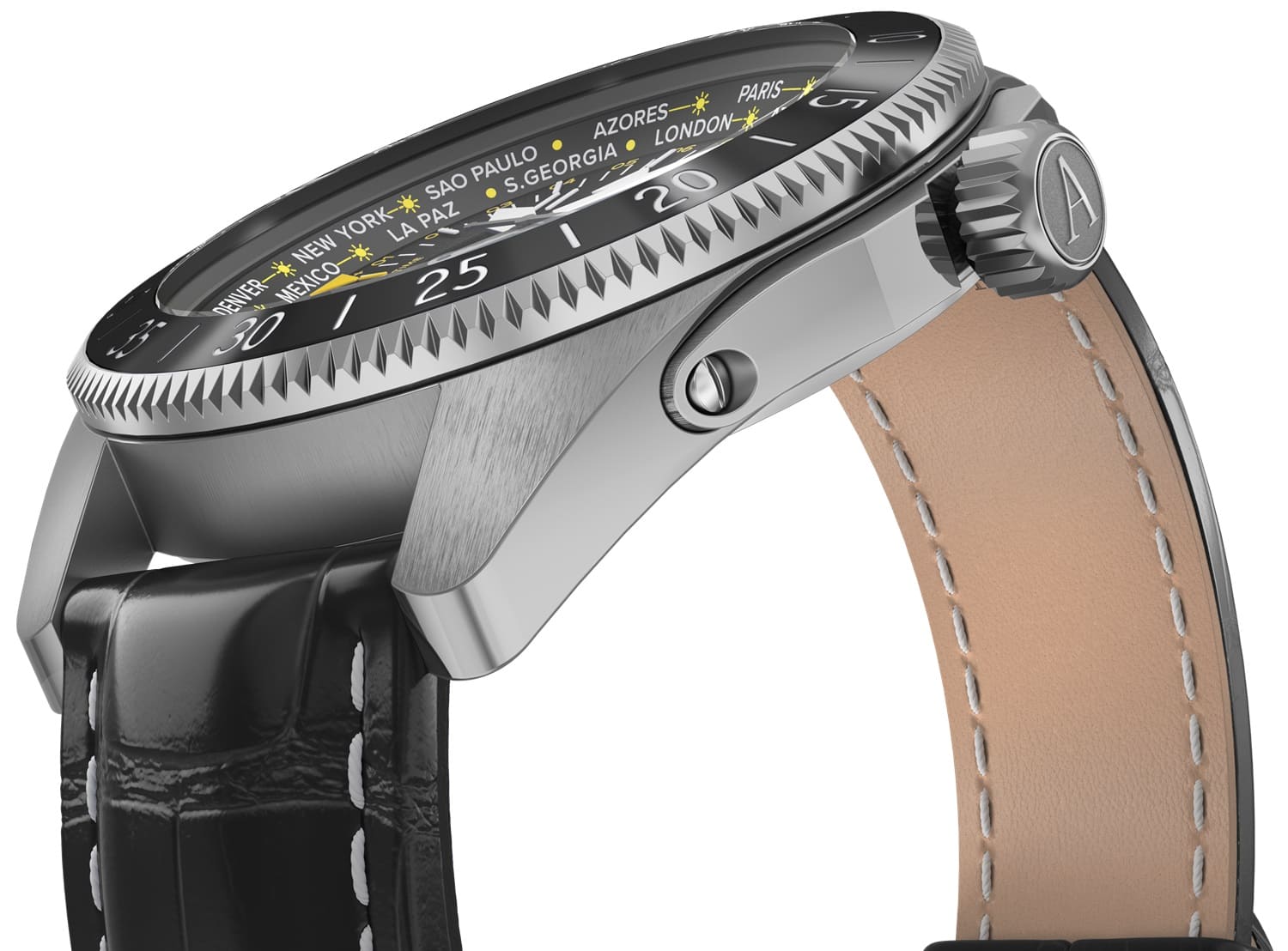 Циферблат отличается детальной функциональностью: в центре — крупные арабские цифры и стрелки, покрытые люминесцентным покрытиемЛюминесцентное покрытиеПозволяет считывать показания времени в темноте. Производители наносят на стрелки, часовые индексы, безель или поверхность циферблата светонакопительный состав, дающий холодное свечение., обеспечивающими мгновенное считывание времени даже в темноте. На «3 часах» — окошко даты, а индикатор второго часового пояса (GMT) удобно расположен на «9 часах». С внешней стороны — вращающийся безельБезельВнешний ободок, закрепляющий стекло. В спортивных часах так называется поворотное кольцо с делениями на циферблате, выполняет роль таймера – замеряет отрезки времени на шкале. Неподвижный безель – элемент декора. Однонаправленно вращающийся безель на дайверских часах позволяет фиксировать моменты погружения и выныривания на поверхность. с PVD-покрытиемPVDУльтратонкое покрытие наносится в технике вакуумного напыления, сочетает в себе нитрид титана особой прочности со слоем золота или оксида хрома. Несёт в себе декоративную или защитную функцию. с насечкой и градусной шкалой для секунд — идеален для расчёта времени пути или времени прибытия .