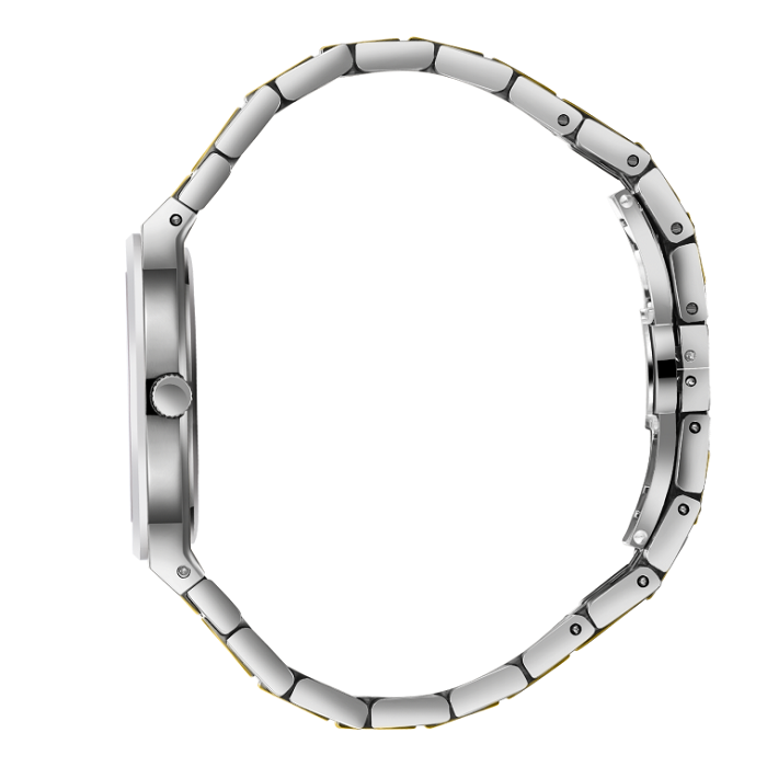 Часы дополнены стальным браслетом с частичным IP-покрытиемIP-покрытиеМетод ионного напыления. Демонстрирует повышенную устойчивость к истиранию, окислению и химическим веществам. Под воздействием высокого давления и температуры около 1500°C молекулы металла надёжно соединяются с частицами корпуса часов. и удобной застёжкой-бабочкойЗастёжка "бабочка"Такой вид застёжки дополняется предохранителями, помогающими избежать случайного раскрытия браслета. Обладают изящным исполнением. , обеспечивающей комфорт и надёжную фиксацию на руке.