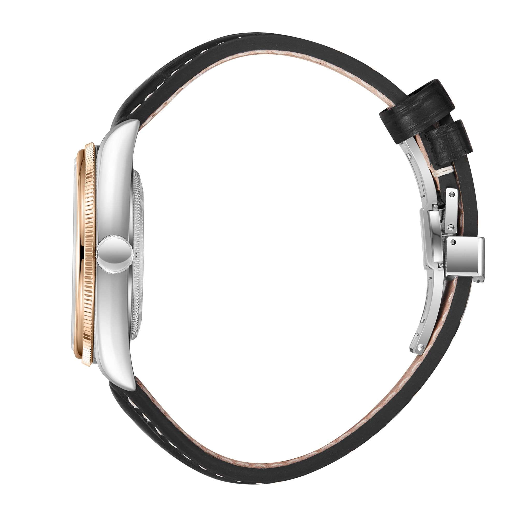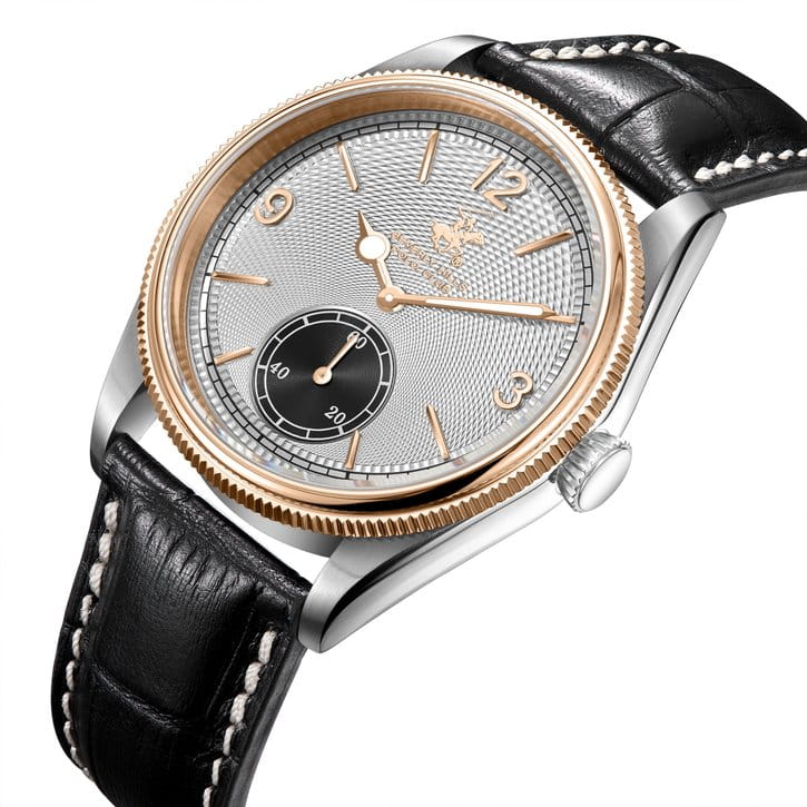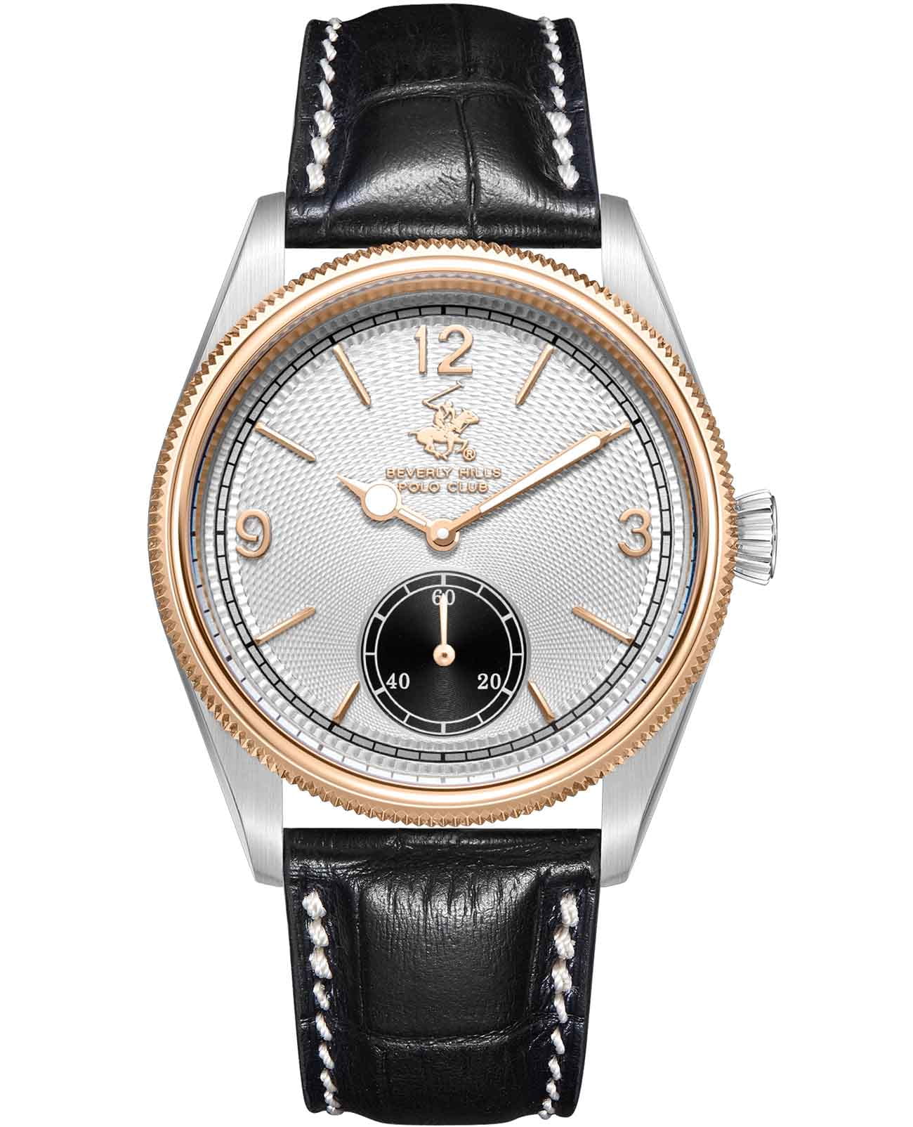 BEVERLY HILLS POLO CLUB BP3807X.561 — стильные мужские часы, сочетающие спортивную динамику и функциональность. Крупный корпус выполнен из нержавеющей стали серебристого цвета, диаметром 39 мм, гармонично дополнен кожаным ремешком на застёжке-бабочке с кнопкамиЗастёжка "бабочка"Такой вид застёжки дополняется предохранителями, помогающими избежать случайного раскрытия браслета. Обладают изящным исполнением. . Рифленый неподвижный безельБезельВнешний ободок, закрепляющий стекло. В спортивных часах так называется поворотное кольцо с делениями на циферблате, выполняет роль таймера – замеряет отрезки времени на шкале. Неподвижный безель – элемент декора. Однонаправленно вращающийся безель на дайверских часах позволяет фиксировать моменты погружения и выныривания на поверхность. с IP-покрытиемIP-покрытиеМетод ионного напыления. Демонстрирует повышенную устойчивость к истиранию, окислению и химическим веществам. Под воздействием высокого давления и температуры около 1500°C молекулы металла надёжно соединяются с частицами корпуса часов. цвета розового золота. Циферблат с акцентными стрелками с люминесцентным покрытиемЛюминесцентное покрытиеПозволяет считывать показания времени в темноте. Производители наносят на стрелки, часовые индексы, безель или поверхность циферблата светонакопительный состав, дающий холодное свечение. делает модель более практичной. Минеральное стеклоМинеральное стеклоМинеральное стекло представляет собой искусственно выращенный минерал кварца. Такое стекло отличается особой устойчивостью к повреждениям и царапинам. Уступает по некоторым качествам сапфировому стеклу. с сапфировым покрытием защищает циферблат от царапин, а кварцевый механизм обеспечивает высокую точность. Благодаря своей универсальной эстетике эти часы уместны и в деловой среде, и в повседневном образе. Идеальный выбор для тех, кто ценит элегантный дизайн и качество. Водозащита до 50 метров позволит защитить корпус от случайных брызг или капель дождя.