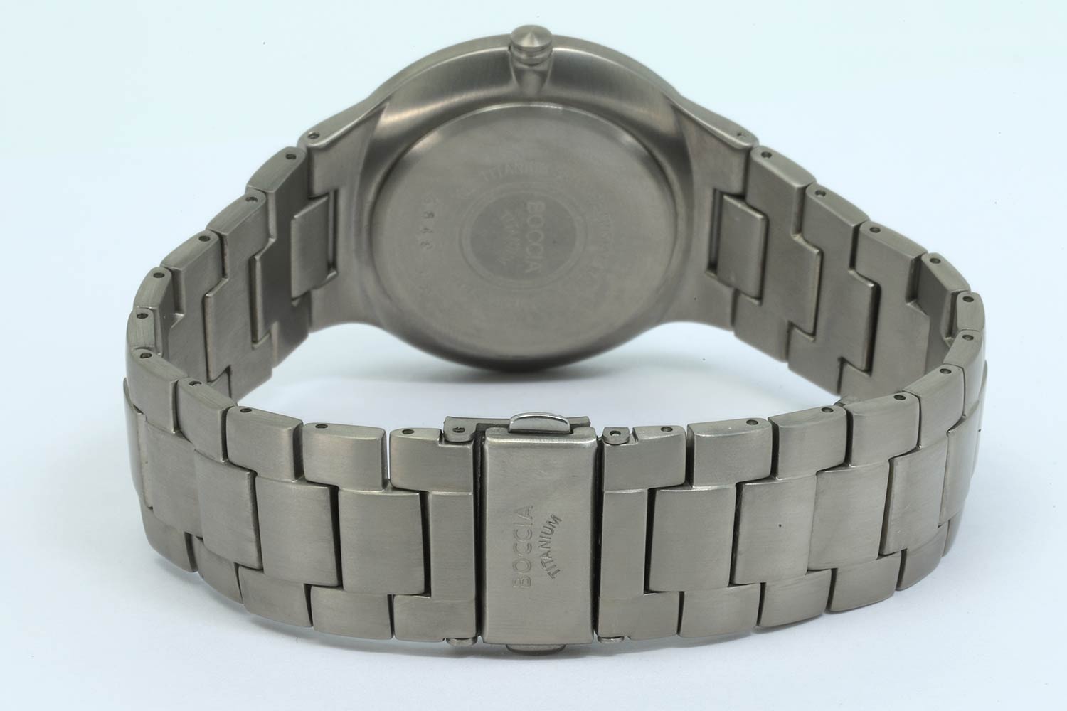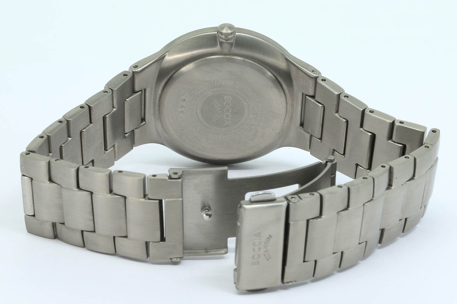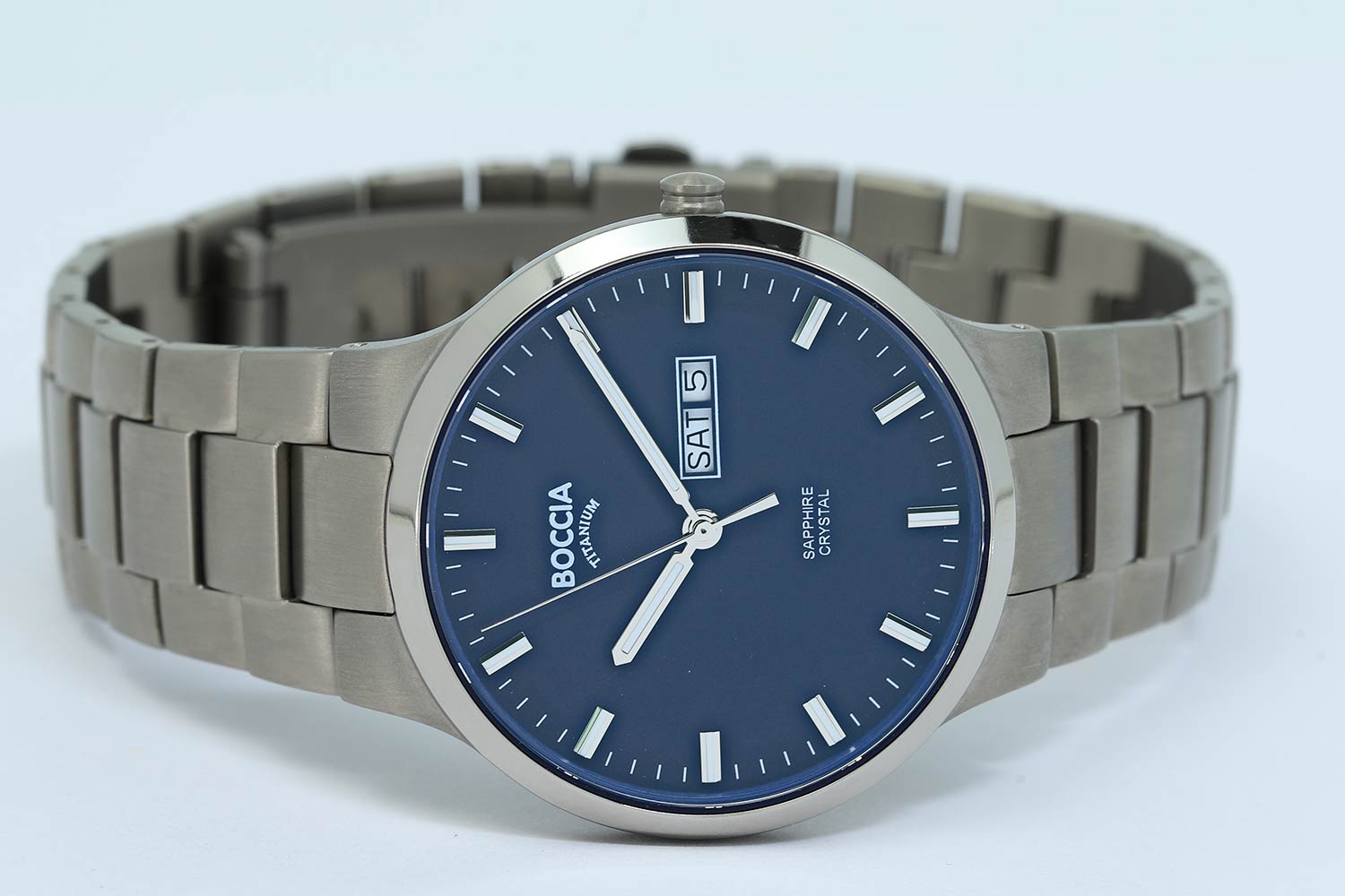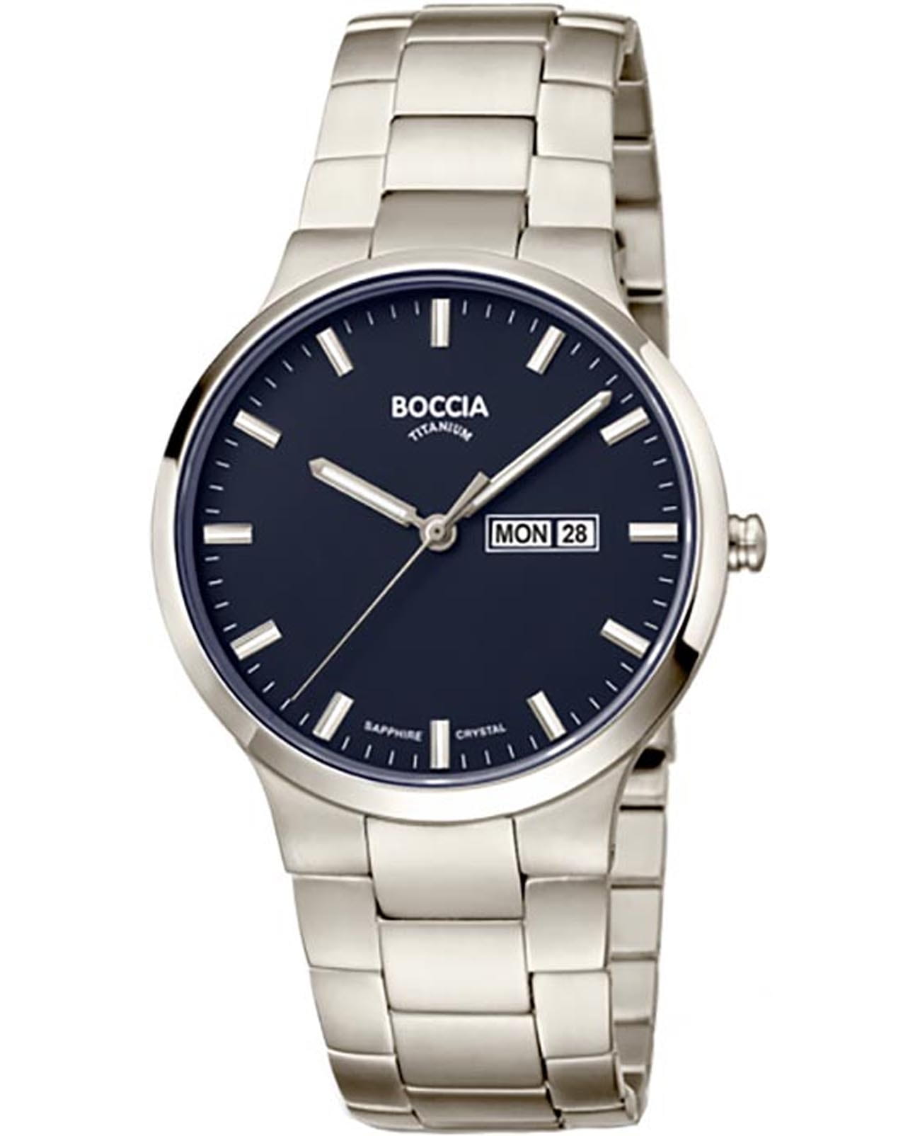 Мужские наручные часы Boccia Titanium 3649-02 с надёжным кварцевым механизмом. Сапфировое стеклоСапфировое стеклоПрочный и надёжный материал из кристалла сапфира синтетического происхождения, характеризующийся особой твёрдостью и устойчивостью к царапинам и повреждениям. устойчивое к мелким механическим повреждениям. Корпус и браслет часов изготовлены из титана. Титановый браслет на раскладной застёжкеРаскладная застёжкаТакой тип застёжки используется только на браслетах из металла. Она никогда не раскрывается полностью, происходит разделение на 2 и более частей. Раскладывающая застёжка снизит вероятность потери часов к минимуму.. Класс водозащиты: 50 метров, позволит защитить корпус от случайных брызг или капель дождя. Стрелки и метки с люминесцентным покрытиемЛюминесцентное покрытиеПозволяет считывать показания времени в темноте. Производители наносят на стрелки, часовые индексы, безель или поверхность циферблата светонакопительный состав, дающий холодное свечение.. Окошки дня недели и даты находятся в положении 3 часа.
