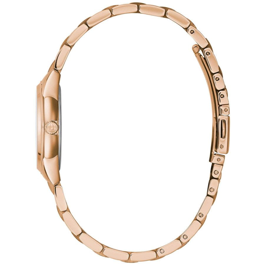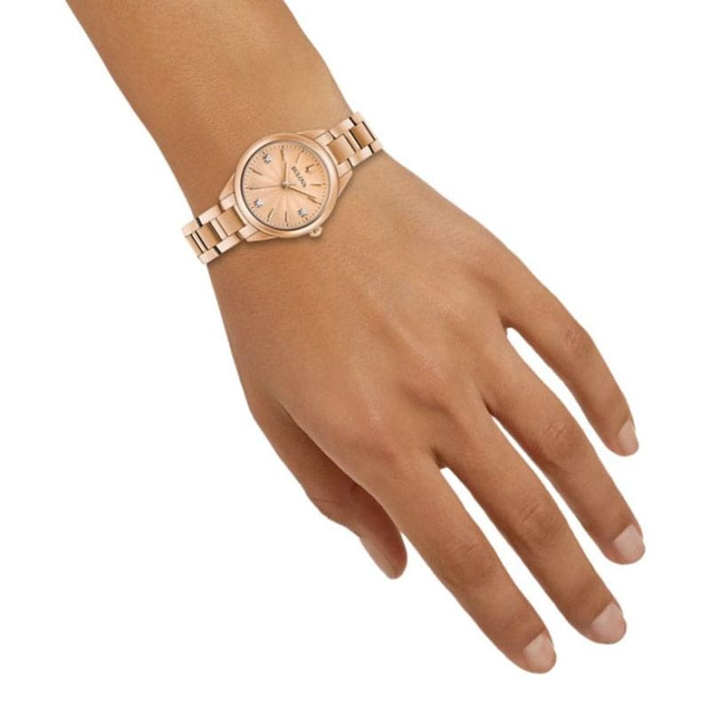 Женские кварцевые часы Bulova Sutton 97P151 – отражающий идеальное сочетание современного дизайна, надёжности и функциональности. Элегантный облик станет превосходным завершением образа, наделив его индивидуальным характером. Корпус из нержавеющей стали с PVD-покрытиемPVDУльтратонкое покрытие наносится в технике вакуумного напыления, сочетает в себе нитрид титана особой прочности со слоем золота или оксида хрома. Несёт в себе декоративную или защитную функцию. цвета розового золота, диаметром 28 мм идеально сбалансирован и элегантен. Минеральное стеклоМинеральное стеклоМинеральное стекло представляет собой искусственно выращенный минерал кварца. Такое стекло отличается особой устойчивостью к повреждениям и царапинам. Уступает по некоторым качествам сапфировому стеклу. защищает циферблат от царапин и устойчивое к мелким механическим повреждениям. Золотистый циферблат украшен бриллиантами. Стальной браслет с PVD-покрытиемPVDУльтратонкое покрытие наносится в технике вакуумного напыления, сочетает в себе нитрид титана особой прочности со слоем золота или оксида хрома. Несёт в себе декоративную или защитную функцию. на раскладной застёжкеРаскладная застёжкаТакой тип застёжки используется только на браслетах из металла. Она никогда не раскрывается полностью, происходит разделение на 2 и более частей. Раскладывающая застёжка снизит вероятность потери часов к минимуму. обеспечивает комфортное ношение. Водозащита 30 метров позволит защитить корпус от случайных брызг или капель дождя. Эта модель – отличный выбор для тех, кто ищет сочетание стиля, качества и функциональности. Часы станут не только полезным аксессуаром, но и выразительным элементом вашего имиджа.