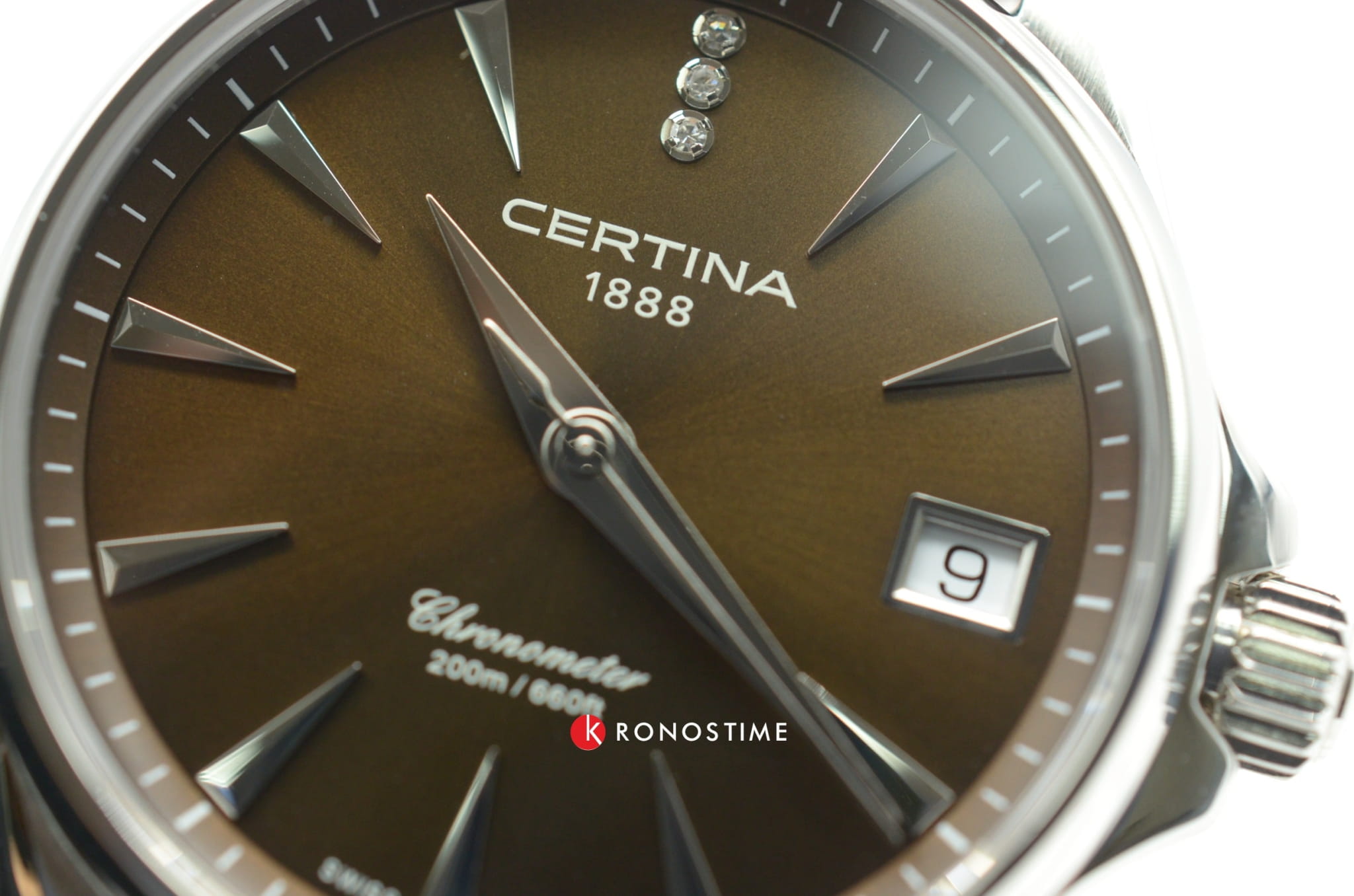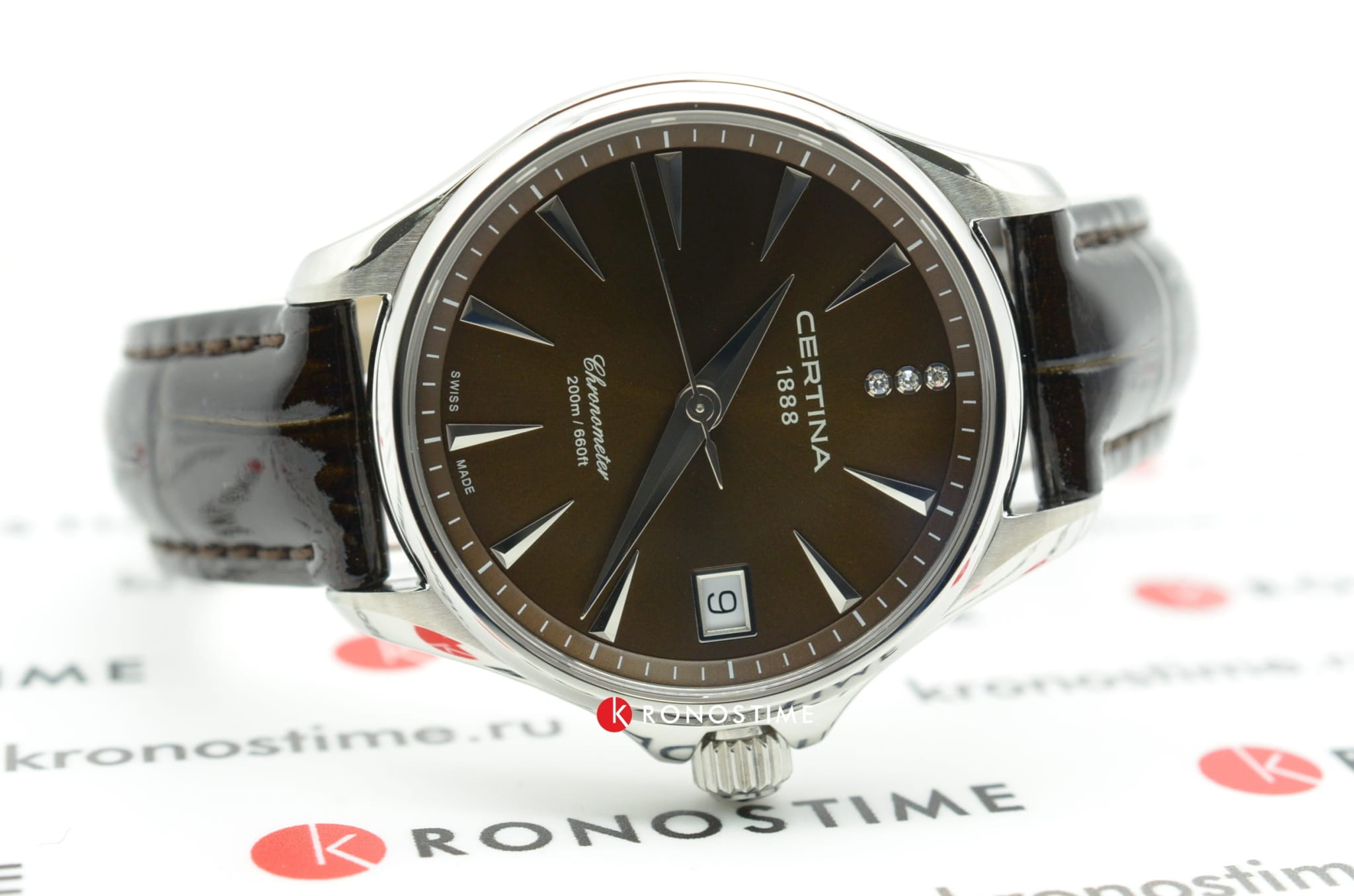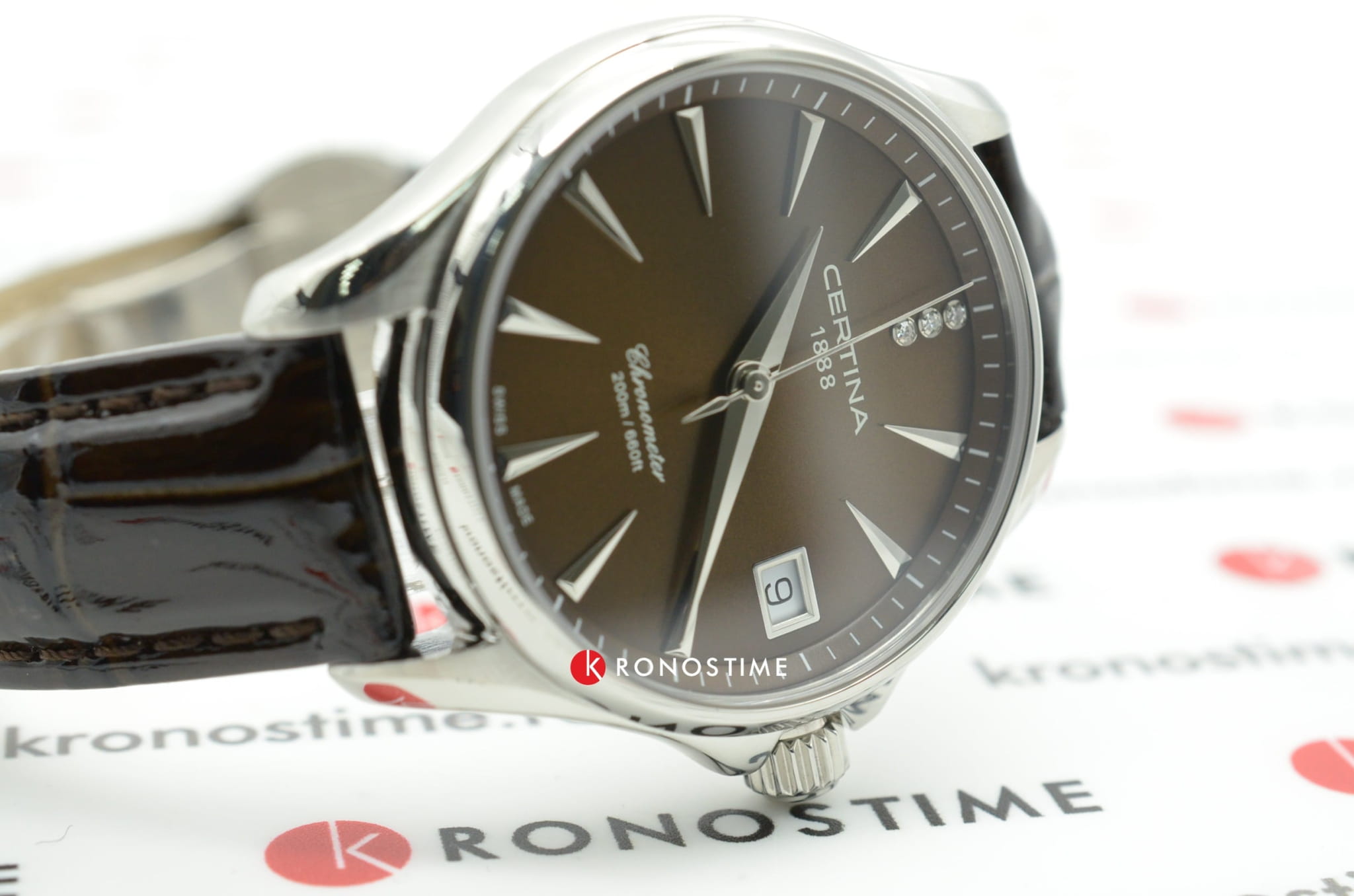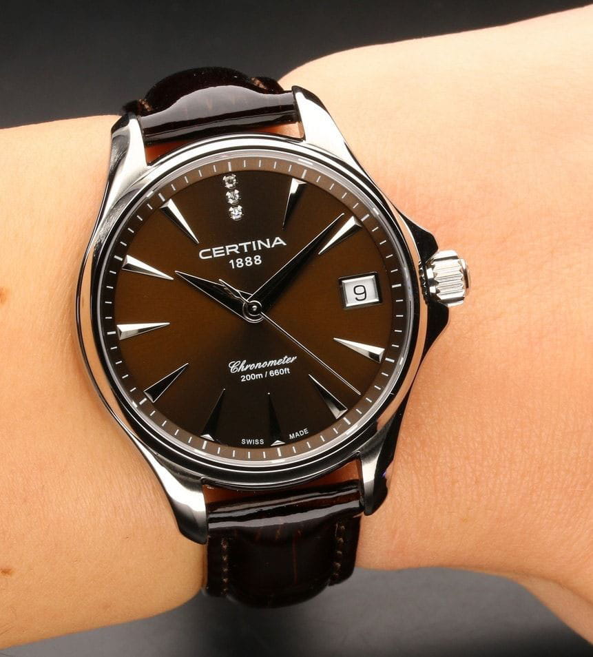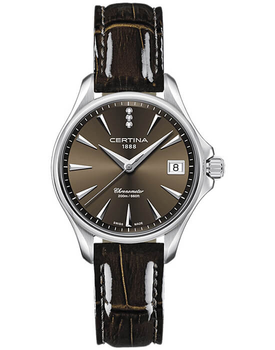 Стильный аксессуар создан для девушек, которые стремятся быть неотразимыми в любой ситуации. Лаконичный циферблат инкрустирован 3 сияющими бриллиантами оттенка Top Wesselton, расположенных на позиции 12 часов. Модель отличается максимальной точностью хода швейцарского кварцевого калибра ETA F06.411 и обладает статусом хронометра, есть сертификат COSCСертификат COSCОфициальный сертификат, подтверждающий то, что часы ходят с особо высокой точностью. Для получения документа часы подвергаются тестовым испытаниям, разработанным швейцарским институтом тестирования хронометров COSC. Допустимая норма для механических часов -4/+6 секунд в день, для кварцевых моделей +/- 0,07 секунд в день.. Стекло из сапфира с односторонним антибликовым покрытием. Концепция Double SecurityDS ConceptDouble Security Concept, обозначает двойную надёжность и безупречную точность часов Certina. Двойная система защиты подразумевает обеспечение максимальной устойчивости к ударам и высоких показателей водонепроницаемости.. Завинчивающаяся задняя крышка. Лакированный кожаный ремешок с . Стальной ударопрочный корпусУдаропрочный корпусМеханизм заключён в корпус, выполненный из современных материалов, устойчивых к ударам, механическим повреждениям и падению с высоты: инновационный пластик, карбон, нержавеющая сталь, титан.. Степень водонепроницаемости WR 200. Индикатор EOLEOLПредставляет собой систему, уведомляющую владельца часов о необходимости замены элемента питания. За 2 недели до полного разряда батарейки секундная стрелка перестаёт ходить чётко и начинает перепрыгивать на 3-4 деления., календарное окошко. Диаметр корпуса: 33,8 мм.
