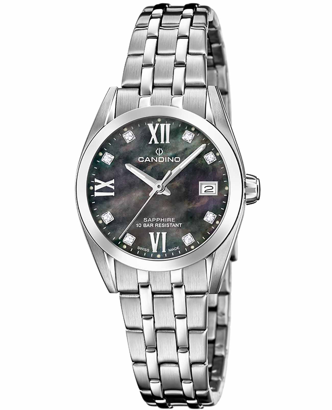 Женские швейцарские часы с сапфировым стекломСапфировое стеклоПрочный и надёжный материал из кристалла сапфира синтетического происхождения, характеризующийся особой твёрдостью и устойчивостью к царапинам и повреждениям. Candino Couple Quartz C4703/G имеют кварцевый механизм с высокой точностью. Сапфировое стеклоСапфировое стеклоПрочный и надёжный материал из кристалла сапфира синтетического происхождения, характеризующийся особой твёрдостью и устойчивостью к царапинам и повреждениям. устойчивое к появлению царапин, обладающее высокой прозрачностью, защищает перламутровый темный циферблат, на котором расположилось окошко даты в районе 3 часа, а также метки с цирконием и римские цифры VI и XII. Корпус часов и их браслет на раскладной застёжкеРаскладная застёжкаТакой тип застёжки используется только на браслетах из металла. Она никогда не раскрывается полностью, происходит разделение на 2 и более частей. Раскладывающая застёжка снизит вероятность потери часов к минимуму. изготовлены из нержавеющей стали, что делает часы прочными и долговечными. Стрелки с люминесцентным покрытиемЛюминесцентное покрытиеПозволяет считывать показания времени в темноте. Производители наносят на стрелки, часовые индексы, безель или поверхность циферблата светонакопительный состав, дающий холодное свечение., что облегчает чтение времени даже в условиях слабого освещения. Класс водозащиты: 100 метров, позволит плавать, нырять и заниматься другими водными видами спорта.