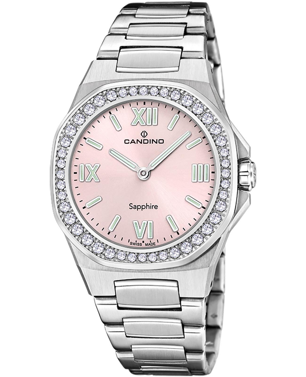 Женские наручные часы Candino Elegance C4753/3 с надёжным кварцевым механизмом. Корпус и браслет часов изготовлены из нержавеющей стали. Сапфировое стеклоСапфировое стеклоПрочный и надёжный материал из кристалла сапфира синтетического происхождения, характеризующийся особой твёрдостью и устойчивостью к царапинам и повреждениям. повышенной прозрачности, устойчивое к мелким механическим повреждениям. Стальной браслет на раскладной застёжкеРаскладная застёжкаТакой тип застёжки используется только на браслетах из металла. Она никогда не раскрывается полностью, происходит разделение на 2 и более частей. Раскладывающая застёжка снизит вероятность потери часов к минимуму.. Стрелки и метки с люминесцентным покрытиемЛюминесцентное покрытиеПозволяет считывать показания времени в темноте. Производители наносят на стрелки, часовые индексы, безель или поверхность циферблата светонакопительный состав, дающий холодное свечение.. БезельБезельВнешний ободок, закрепляющий стекло. В спортивных часах так называется поворотное кольцо с делениями на циферблате, выполняет роль таймера – замеряет отрезки времени на шкале. Неподвижный безель – элемент декора. Однонаправленно вращающийся безель на дайверских часах позволяет фиксировать моменты погружения и выныривания на поверхность. инкрустирован кристаллами. Класс водозащиты: 50 метров, позволит защитить корпус от случайных брызг или капель дождя.