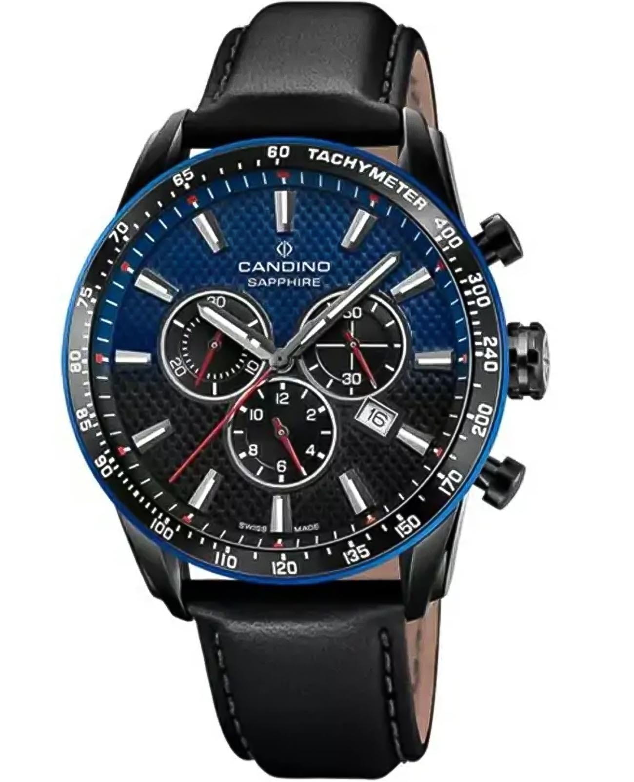 Швейцарские мужские наручные часы-хронографХронографФункция позволяет измерять отрезки времени с особой точностью: часы, минуты, секунды. Верным признаком хронографа является наличие на циферблате 3 дополнительных окошек-счётчиков. Candino Gents Sport C4759/2, кварцевый механизм с высокой точностью. Сапфировое стеклоСапфировое стеклоПрочный и надёжный материал из кристалла сапфира синтетического происхождения, характеризующийся особой твёрдостью и устойчивостью к царапинам и повреждениям. устойчивое к появлению царапин, обладающее высокой прозрачностью. Часы, минуты, секунды. Окошко даты находится в положении 4 часа. Класс водозащиты: 100 метров, позволит плавать, нырять и заниматься другими водными видами спорта. Корпус часов изготовлен из нержавеющей стали с PVD-покрытиемPVDУльтратонкое покрытие наносится в технике вакуумного напыления, сочетает в себе нитрид титана особой прочности со слоем золота или оксида хрома. Несёт в себе декоративную или защитную функцию.. Стрелки и метки с люминесцентным покрытиемЛюминесцентное покрытиеПозволяет считывать показания времени в темноте. Производители наносят на стрелки, часовые индексы, безель или поверхность циферблата светонакопительный состав, дающий холодное свечение.. Кожаный ремешок на стандартной застёжке. БезельБезельВнешний ободок, закрепляющий стекло. В спортивных часах так называется поворотное кольцо с делениями на циферблате, выполняет роль таймера – замеряет отрезки времени на шкале. Неподвижный безель – элемент декора. Однонаправленно вращающийся безель на дайверских часах позволяет фиксировать моменты погружения и выныривания на поверхность. со шкалой тахиметраТахиметрРазмеченная шкала, располагается на ободке или безеле часов. Тахиметр позволяет рассчитать скорость на определённом участке пути, расстояние измеряется в километрах или милях..