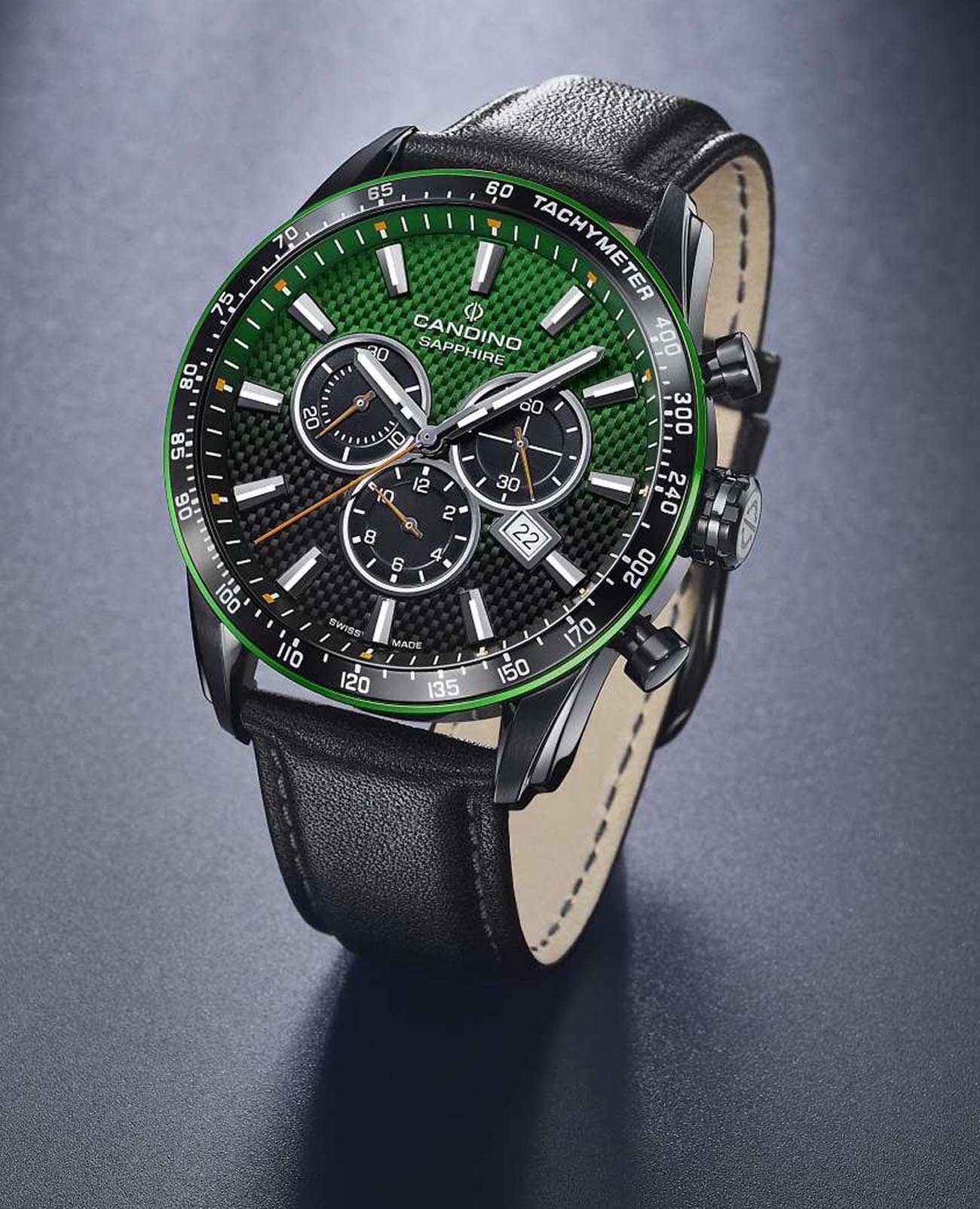 Швейцарские мужские наручные часы-хронографХронографФункция позволяет измерять отрезки времени с особой точностью: часы, минуты, секунды. Верным признаком хронографа является наличие на циферблате 3 дополнительных окошек-счётчиков. Candino Gents Sport C4759/3, кварцевый механизм с высокой точностью. Сапфировое стеклоСапфировое стеклоПрочный и надёжный материал из кристалла сапфира синтетического происхождения, характеризующийся особой твёрдостью и устойчивостью к царапинам и повреждениям. устойчивое к появлению царапин, обладающее высокой прозрачностью. Часы, минуты, секунды. Окошко даты находится в положении 4 часа. Класс водозащиты: 100 метров, позволит плавать, нырять и заниматься другими водными видами спорта. Корпус часов изготовлен из нержавеющей стали с PVD-покрытиемPVDУльтратонкое покрытие наносится в технике вакуумного напыления, сочетает в себе нитрид титана особой прочности со слоем золота или оксида хрома. Несёт в себе декоративную или защитную функцию.. Стрелки и метки с люминесцентным покрытиемЛюминесцентное покрытиеПозволяет считывать показания времени в темноте. Производители наносят на стрелки, часовые индексы, безель или поверхность циферблата светонакопительный состав, дающий холодное свечение.. Кожаный ремешок на стандартной застёжке. БезельБезельВнешний ободок, закрепляющий стекло. В спортивных часах так называется поворотное кольцо с делениями на циферблате, выполняет роль таймера – замеряет отрезки времени на шкале. Неподвижный безель – элемент декора. Однонаправленно вращающийся безель на дайверских часах позволяет фиксировать моменты погружения и выныривания на поверхность. со шкалой тахиметраТахиметрРазмеченная шкала, располагается на ободке или безеле часов. Тахиметр позволяет рассчитать скорость на определённом участке пути, расстояние измеряется в километрах или милях..