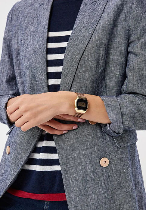 Корпус в цвете розового золота из прочного полимерного пластика имеет легендарную 8-угольную форму, компактный аксессуар одинаково хорошо смотрится как с офисной рубашкой, так и с повседневной футболкой. Электронный дисплей имеет подсветку, его надёжную защиту от повреждений обеспечивает минеральное стекло. Браслет из нержавеющей стали 316L на долгие годы сохранит первоначальный вид. Будильник, автоматический календарь. Габариты: 38,6 x 36,3 x 9,6 мм.
