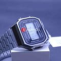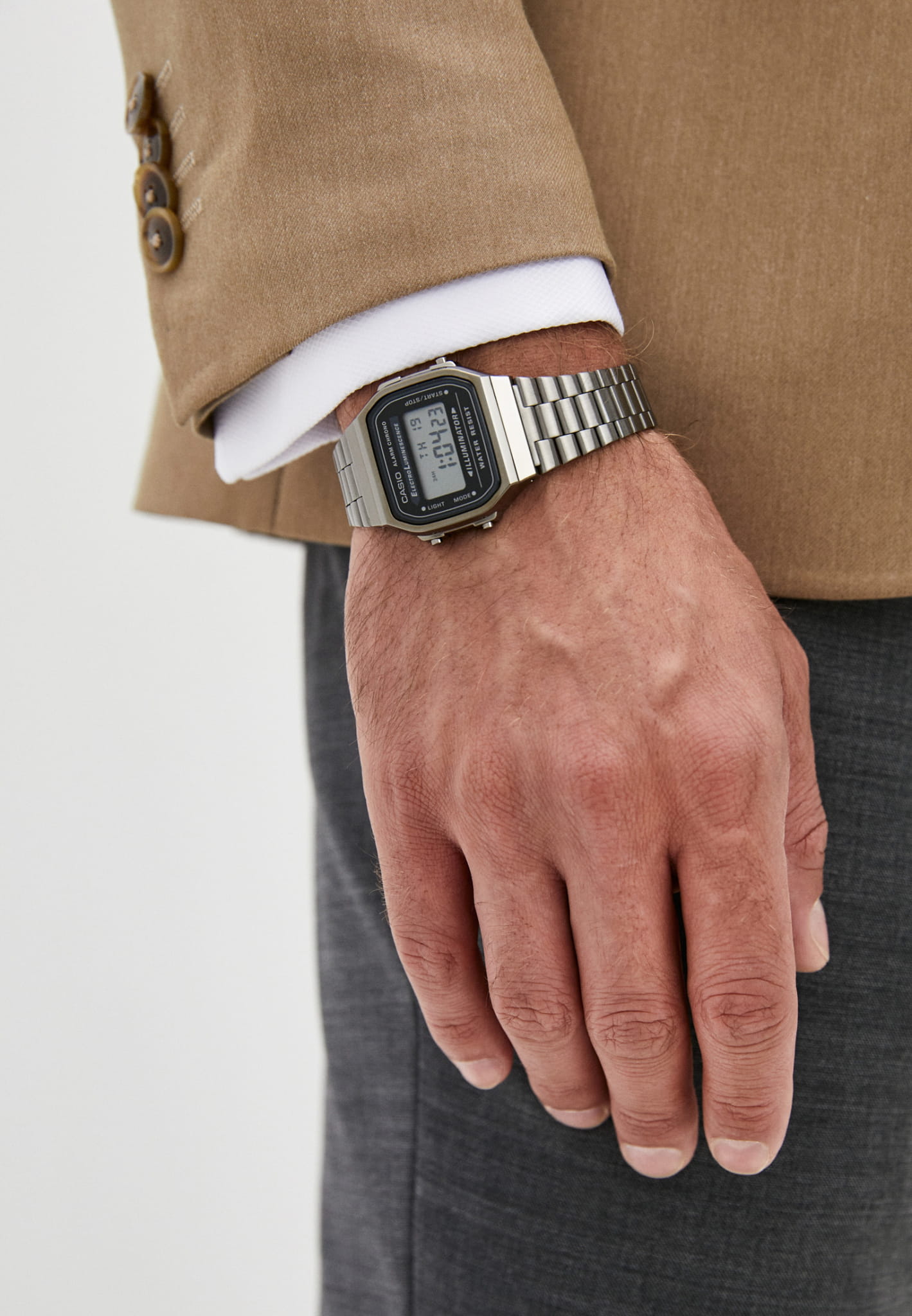 Стильные мужские наручные часы A168WGG-1A с подсветкой. Корпус - Пластиковый; Стекло - Пластик; Водозащита - 30 м. (WR 30); Материал ремешка - Нержавеющая сталь с iP покрытием; Цвет ремешка - Серый; Цвет циферблата - Lcd.