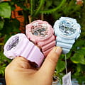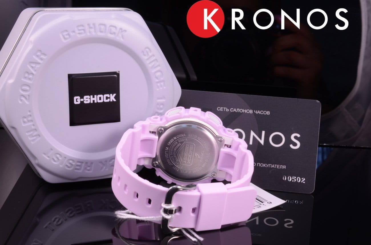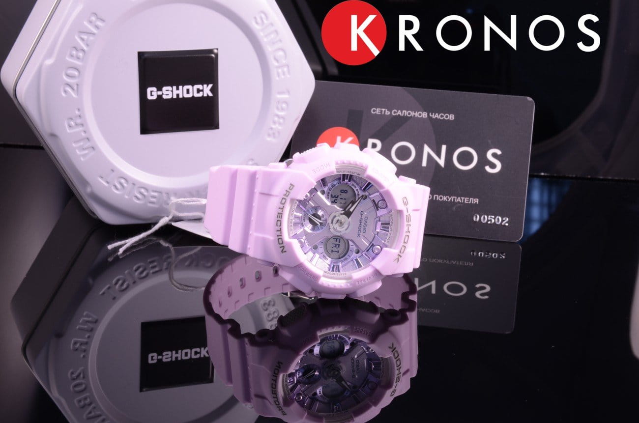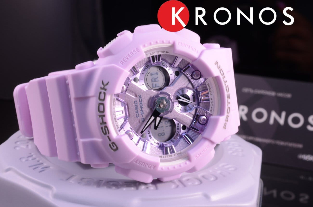 Японские женские часы GMA-S120DP-6AER из коллекции G-Shock представлены в спортивном облачении, но их пастельно-сиреневый оттенок позволяет продемонстрировать изысканную натуру.
