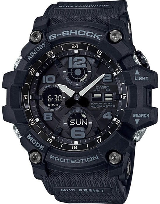 Наручные часы в чёрном исполнении относятся к линейке Mudmaster, массивная модель с крупными деталями на вашем запястье точно не останется незамеченной. Ключевой особенностью стал герметичный ударопрочный корпусУдаропрочный корпусМеханизм заключён в корпус, выполненный из современных материалов, устойчивых к ударам, механическим повреждениям и падению с высоты: инновационный пластик, карбон, нержавеющая сталь, титан., способный препятствовать попаданию внутрь пыли, песка и грязи. Также ему не страшны вибрации, падение и удары. Это часы на солнечной батарее с технологией , время работы аккумулятора без подзарядки составляет 7 месяцев. Специальный индикатор позволяет следить за уровнем зарядки. Минеральное стекло. Двойная светодиодная подсветкаСветодиодная подсветкаСветодиодная или LED-подсветка обеспечивает появление яркого холодного свечения за счёт LED-элементов - маленьких лампочек. Они потребляют минимальное количество энергии, чаще всего можно встретить 1 светодиод, в нижней части циферблата. ЖК-дисплея и циферблата. Удобный полимерный ремешок. Стрелки с люминесцентной подсветкойЛюминесцентное покрытиеПозволяет считывать показания времени в темноте. Производители наносят на стрелки, часовые индексы, безель или поверхность циферблата светонакопительный состав, дающий холодное свечение.. Водостойкость 20 бар. Коррекция времени по радиосигналу, функция мирового времениМировое время Полезное часовое усложнение, отображающее время в основных городах и известных областях по всему миру, оно связано с часовыми поясами, удобно для путешественников и бизнесменов. , автоматический календарь, будильник, таймер, секундомер. Габариты: 56,2 x 54,9 x 17,3 мм.