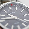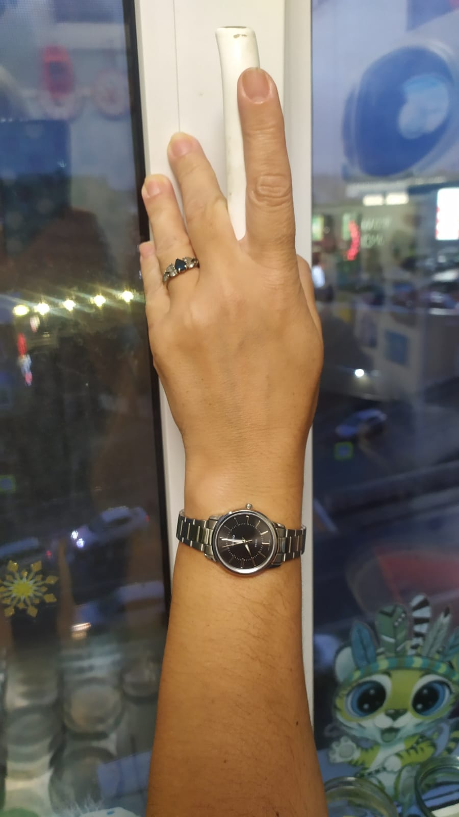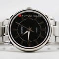 Серебристый цвет хорошо гармонирует с чёрным циферблатом. Стрелки светятся в темноте. Защита от воды до 50м.