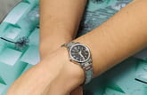 Серебристый блеск нержавеющей стали 316L гармонирует со строгим чёрным циферблатом, это позволяет подчеркнуть стремление владелицы к лаконичным и элегантным вещам. Кварцевый механизм с точностью хода +/- 20 секунд в месяц. Стрелки с люминесцентной подсветкойЛюминесцентное покрытиеПозволяет считывать показания времени в темноте. Производители наносят на стрелки, часовые индексы, безель или поверхность циферблата светонакопительный состав, дающий холодное свечение.. Минеральное стекло устойчиво к появлению царапин. Водостойкость 50 метров. Габариты: 30 x 35,5 x 7,5 мм.
