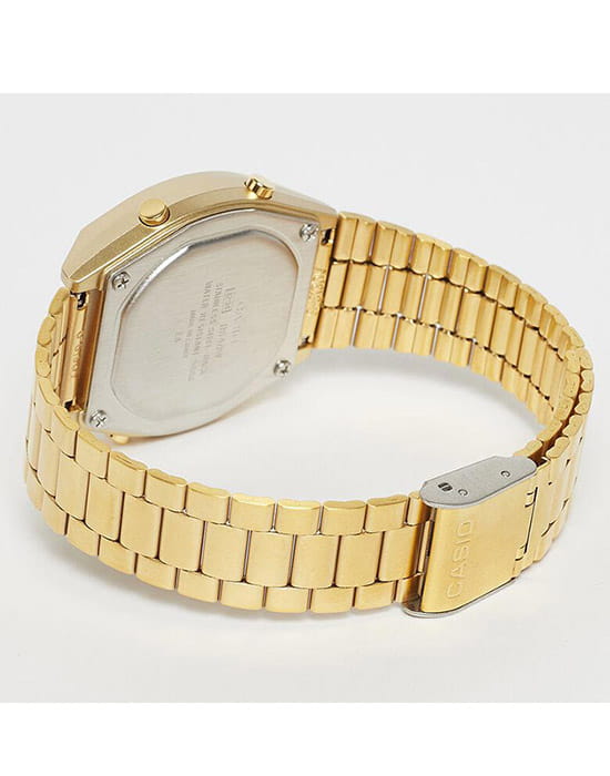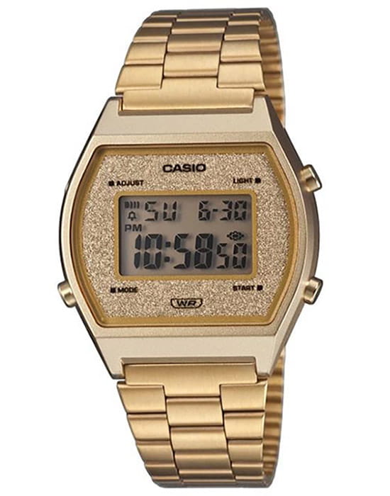 Первые модели от Casio выпускались в квадратном корпусе, который успешно реализован в аксессуаре B640WCG-5EF. Он стал не только стильным элементом часов, но и напоминанием о прошлых успехах бренда. Привлекательно смотрится цифровой дисплей с блестящей окантовкой, оттенок подобран в тон браслету. Он выполнен из нержавеющей стали 316L с IP-покрытиемIP-покрытиеМетод ионного напыления. Демонстрирует повышенную устойчивость к истиранию, окислению и химическим веществам. Под воздействием высокого давления и температуры около 1500°C молекулы металла надёжно соединяются с частицами корпуса часов., дополнительно защищающим от царапин. Яркая светодиодная подсветкаСветодиодная подсветкаСветодиодная или LED-подсветка обеспечивает появление яркого холодного свечения за счёт LED-элементов - маленьких лампочек. Они потребляют минимальное количество энергии, чаще всего можно встретить 1 светодиод, в нижней части циферблата. позволяет использовать часы в темноте, LED-индикатор мигает при окончании работы секундомера или таймера. Работ модели обеспечивает японский кварцевый механизм, батарейка которого рассчитана на 3 года службы. Циферблат защищён акриловым стеклом, устойчивым к повреждениям. Наручные ретро-часы имеют водостойкость 50 метров и без проблем выдержат мойку машины, душ, дождь. Удобна функция будильника, календаря. Габариты: 38,9 x 35 x 9,9 мм.
