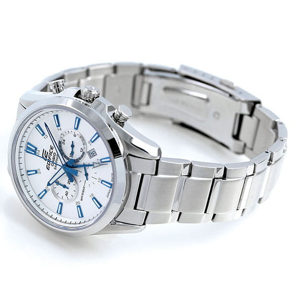 Японские мужские наручные часы на солнечной батарее Casio Edifice EFB-504JD-7A, кварцевый механизм с высокой точностью. Сапфировое стекло устойчивое к появлению царапин, обладающее высокой прозрачностью. Класс водозащиты: 100 метров, позволит плавать, нырять и заниматься другими водными видами спорта. Корпус часов изготовлен из стали, серебристого цвета.