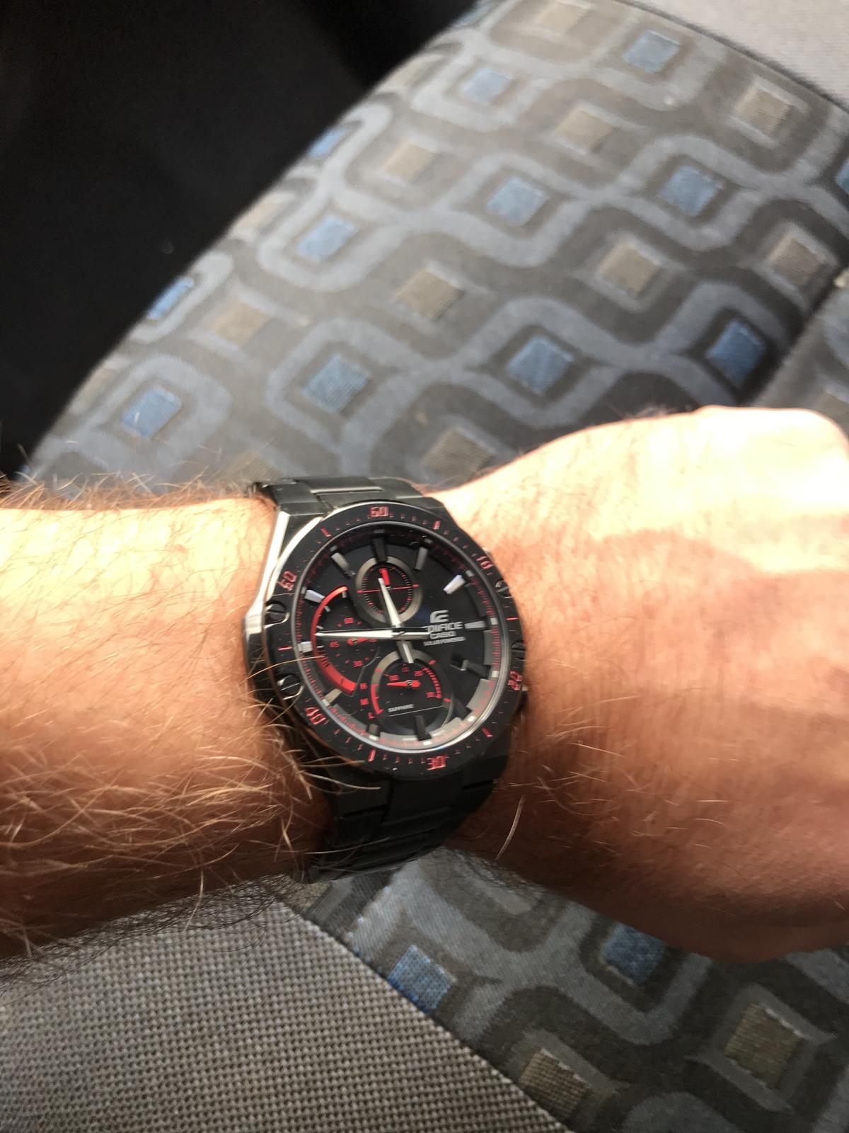Наручные часы в чёрном исполнении привлекают красными деталями и лаконичным оформлением. Помогут идеально дополнить образ на каждый день. Аксессуар стал обладателем ультратонкого корпуса, по сравнению с большинством представителей Edifice – 9,9 мм. Модель изготовлена из стали 316L с ионным IP-покрытиемIP-покрытиеМетод ионного напыления. Демонстрирует повышенную устойчивость к истиранию, окислению и химическим веществам. Под воздействием высокого давления и температуры около 1500°C молекулы металла надёжно соединяются с частицами корпуса часов., материал устойчив к коррозии и механическим воздействиям. Японский кварцевый механизм обеспечивает питанием солнечная батарейка . Указатель минутной стрелки хронографаХронографФункция позволяет измерять отрезки времени с особой точностью: часы, минуты, секунды. Верным признаком хронографа является наличие на циферблате 3 дополнительных окошек-счётчиков. на секторной части циферблата. Сапфировое стекло с антибликовым покрытием. Водостойкость 100 метров. Люминесцентная подсветкаЛюминесцентное покрытиеПозволяет считывать показания времени в темноте. Производители наносят на стрелки, часовые индексы, безель или поверхность циферблата светонакопительный состав, дающий холодное свечение.. Застёжка с системой блокировки. Секундомер, отображение числа. Габариты: 50,2 x 45,4 x 9,9 мм.