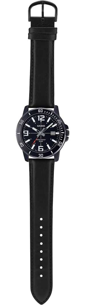 Отличная модель часов, которая станет идеальным вариантом на каждый день. Японские мужские часы с минеральным стекломМинеральное стеклоМинеральное стекло представляет собой искусственно выращенный минерал кварца. Такое стекло отличается особой устойчивостью к повреждениям и царапинам. Уступает по некоторым качествам сапфировому стеклу. Casio Collection MTP-VD01BL-1B, кварцевый механизм с высокой точностью. Корпус часов изготовлен из стали с IP-покрытиемIP-покрытиеМетод ионного напыления. Демонстрирует повышенную устойчивость к истиранию, окислению и химическим веществам. Под воздействием высокого давления и температуры около 1500°C молекулы металла надёжно соединяются с частицами корпуса часов.. Люминесцентная подсветкаЛюминесцентное покрытиеПозволяет считывать показания времени в темноте. Производители наносят на стрелки, часовые индексы, безель или поверхность циферблата светонакопительный состав, дающий холодное свечение.. 12-ти и 24-х часовой формат времени, число и день недели вынесены на отдельные циферблаты. Метки в виде штрихов и точек. Заводная головка с защитой. Ремешок с классической застежкой.