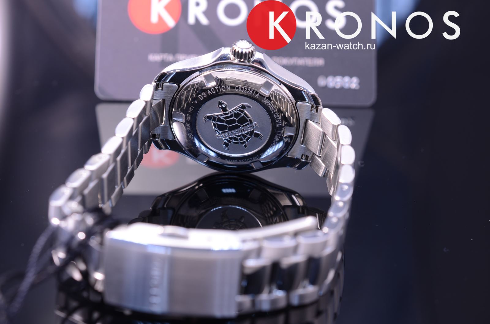 Компактный циферблат дополнен золотистыми деталями и привлекательным волновым узором, что стало выражением любви бренда к водной тематике. Отражением морского характера стал вращающийся безельБезельВнешний ободок, закрепляющий стекло. В спортивных часах так называется поворотное кольцо с делениями на циферблате, выполняет роль таймера – замеряет отрезки времени на шкале. Неподвижный безель – элемент декора. Однонаправленно вращающийся безель на дайверских часах позволяет фиксировать моменты погружения и выныривания на поверхность., водостойкость WR 300, завинчивающаяся заводная головка и задняя крышка. Высокая точность хода швейцарского кварцевого калибра F04.411 Precidrive™Precidrive™Инновационный кварцевый механизм Certina. Часы, оснащённые этим швейцарским калибром, приравниваются к точности к сертифицированным хронометрам, точность хода составляет +/-10 секунд в год. стала весомым основанием для получения сертификата хронометра COSCСертификат COSCОфициальный сертификат, подтверждающий то, что часы ходят с особо высокой точностью. Для получения документа часы подвергаются тестовым испытаниям, разработанным швейцарским институтом тестирования хронометров COSC. Допустимая норма для механических часов -4/+6 секунд в день, для кварцевых моделей +/- 0,07 секунд в день.. Система DS ConceptDS ConceptDouble Security Concept, обозначает двойную надёжность и безупречную точность часов Certina. Двойная система защиты подразумевает обеспечение максимальной устойчивости к ударам и высоких показателей водонепроницаемости.. Стальной ударопрочный корпусУдаропрочный корпусМеханизм заключён в корпус, выполненный из современных материалов, устойчивых к ударам, механическим повреждениям и падению с высоты: инновационный пластик, карбон, нержавеющая сталь, титан. и браслет. Сапфировое стекло с покрытием «антиблик». Индикатор EOLEOLПредставляет собой систему, уведомляющую владельца часов о необходимости замены элемента питания. За 2 недели до полного разряда батарейки секундная стрелка перестаёт ходить чётко и начинает перепрыгивать на 3-4 деления., отображение числа. Диаметр корпуса: 34 мм.