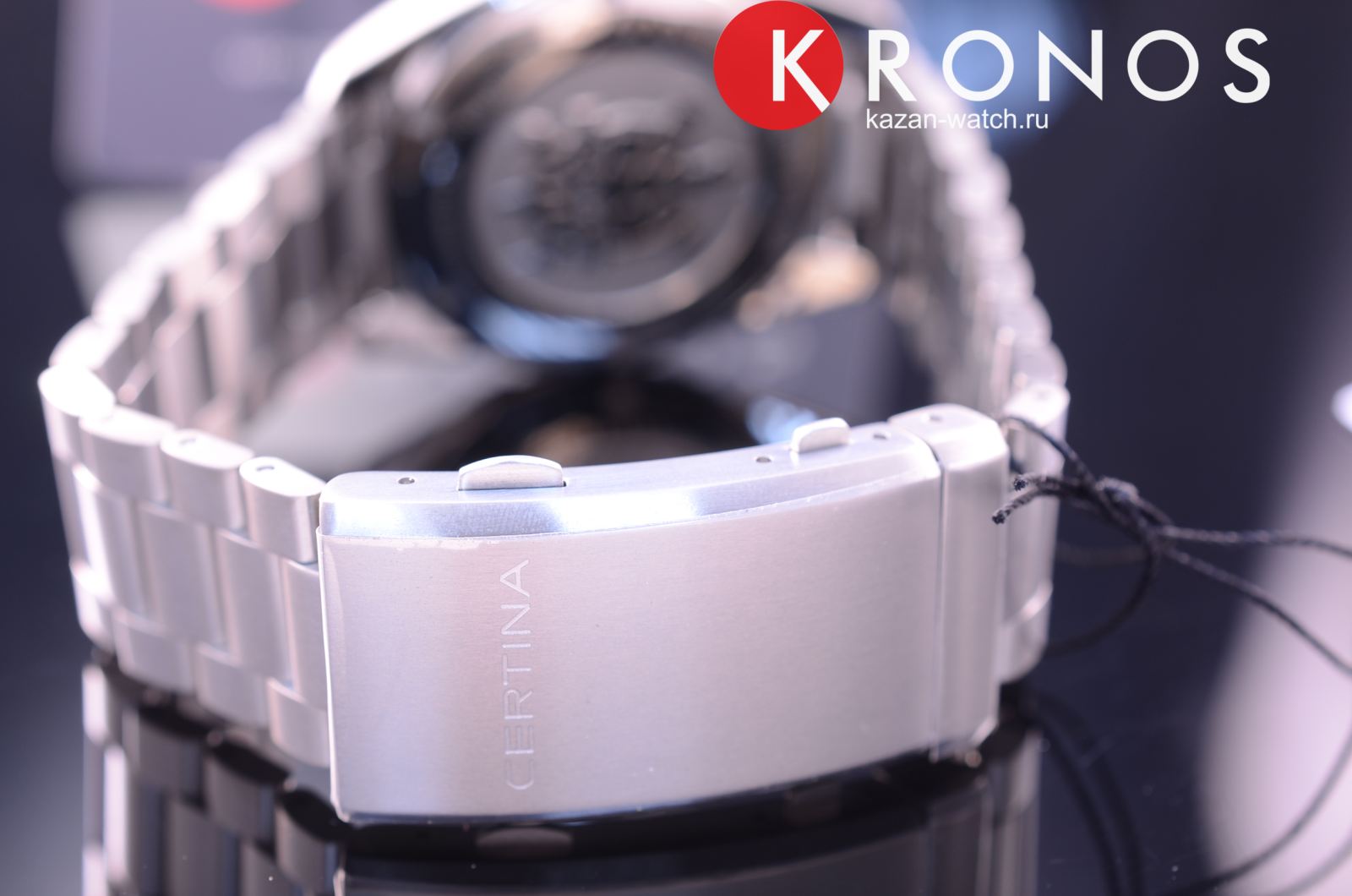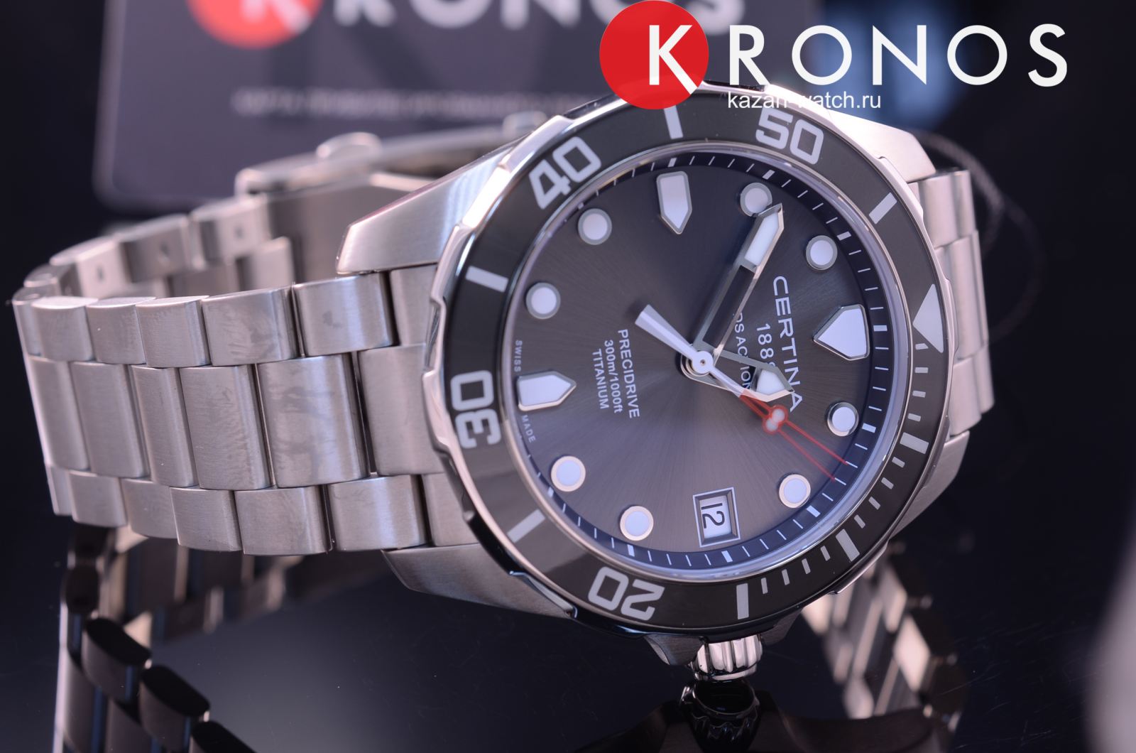 Наручные часы представляют собой настоящий шедевр, безупречно всё: от продуманного дизайна до высокого качества исполнения. Модель выполнена из титана, отличающегося устойчивостью к воздействию магнитных полей и морской воды. Швейцарский кварцевый механизм ETA F07.411 Precidrive™Precidrive™Инновационный кварцевый механизм Certina. Часы, оснащённые этим швейцарским калибром, приравниваются к точности к сертифицированным хронометрам, точность хода составляет +/-10 секунд в год. демонстрирует максимальную точность хода. Сапфировое стекло с антибликовой поверхностью. Односторонне вращающийся безельБезельВнешний ободок, закрепляющий стекло. В спортивных часах так называется поворотное кольцо с делениями на циферблате, выполняет роль таймера – замеряет отрезки времени на шкале. Неподвижный безель – элемент декора. Однонаправленно вращающийся безель на дайверских часах позволяет фиксировать моменты погружения и выныривания на поверхность.. Реализация концепции Double SecurityDS ConceptDouble Security Concept, обозначает двойную надёжность и безупречную точность часов Certina. Двойная система защиты подразумевает обеспечение максимальной устойчивости к ударам и высоких показателей водонепроницаемости.. Водонепроницаемость при давлении до 30 бар. Застёжка с фиксатором и удлинением для дайверовУдлинение для дайверовЗастёжка с удлинением для дайверов представляет собой безопасное крепление, которое позволяет надевать часы поверх гидрокостюма. Гибкая застёжка удлиняется на 1-2 миллиметра.. Яркая люминесцентная подсветкаЛюминесцентное покрытиеПозволяет считывать показания времени в темноте. Производители наносят на стрелки, часовые индексы, безель или поверхность циферблата светонакопительный состав, дающий холодное свечение.. Окошко даты, индикатор EOLEOLПредставляет собой систему, уведомляющую владельца часов о необходимости замены элемента питания. За 2 недели до полного разряда батарейки секундная стрелка перестаёт ходить чётко и начинает перепрыгивать на 3-4 деления.. Диаметр корпуса: 41 мм.