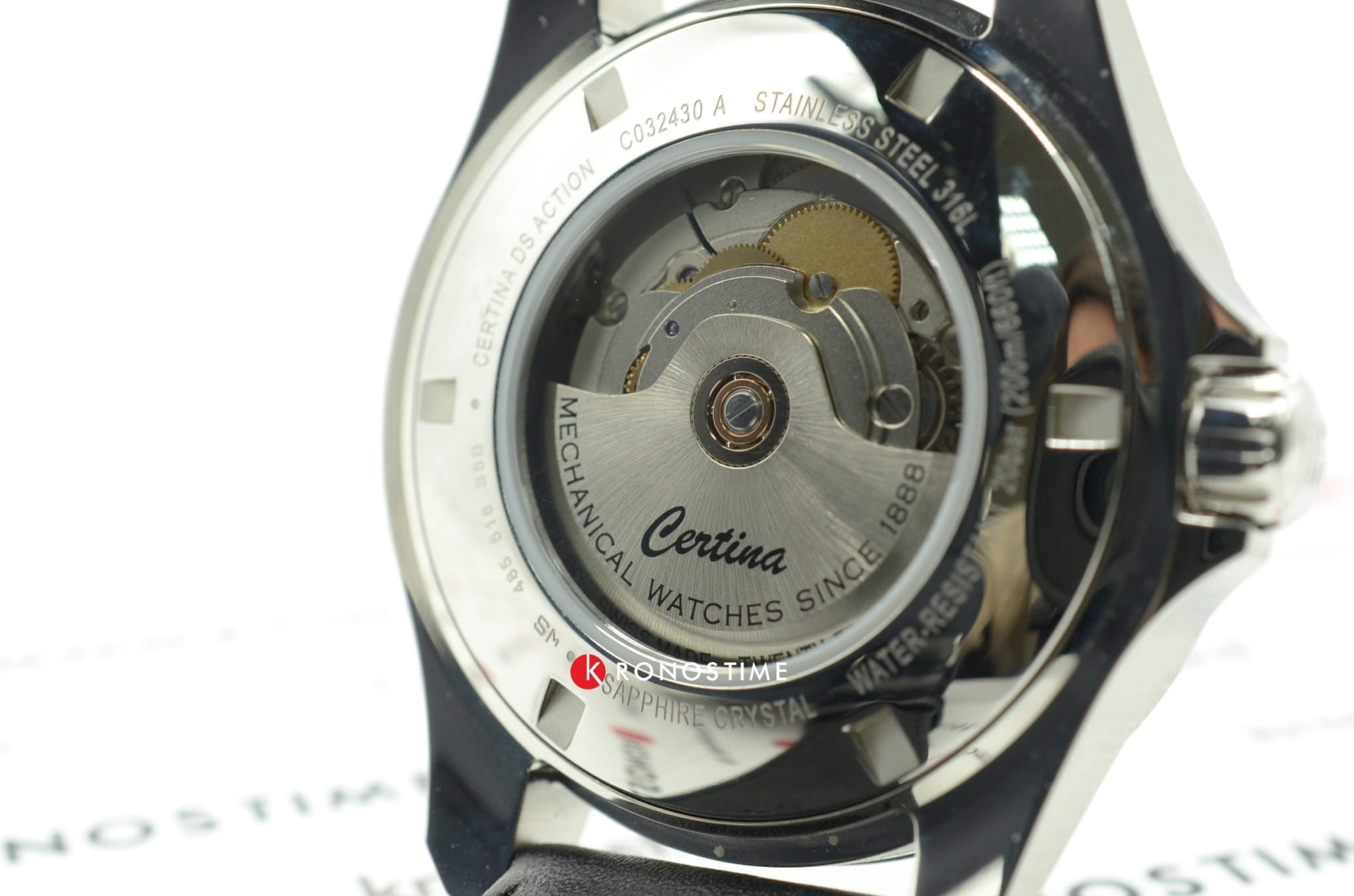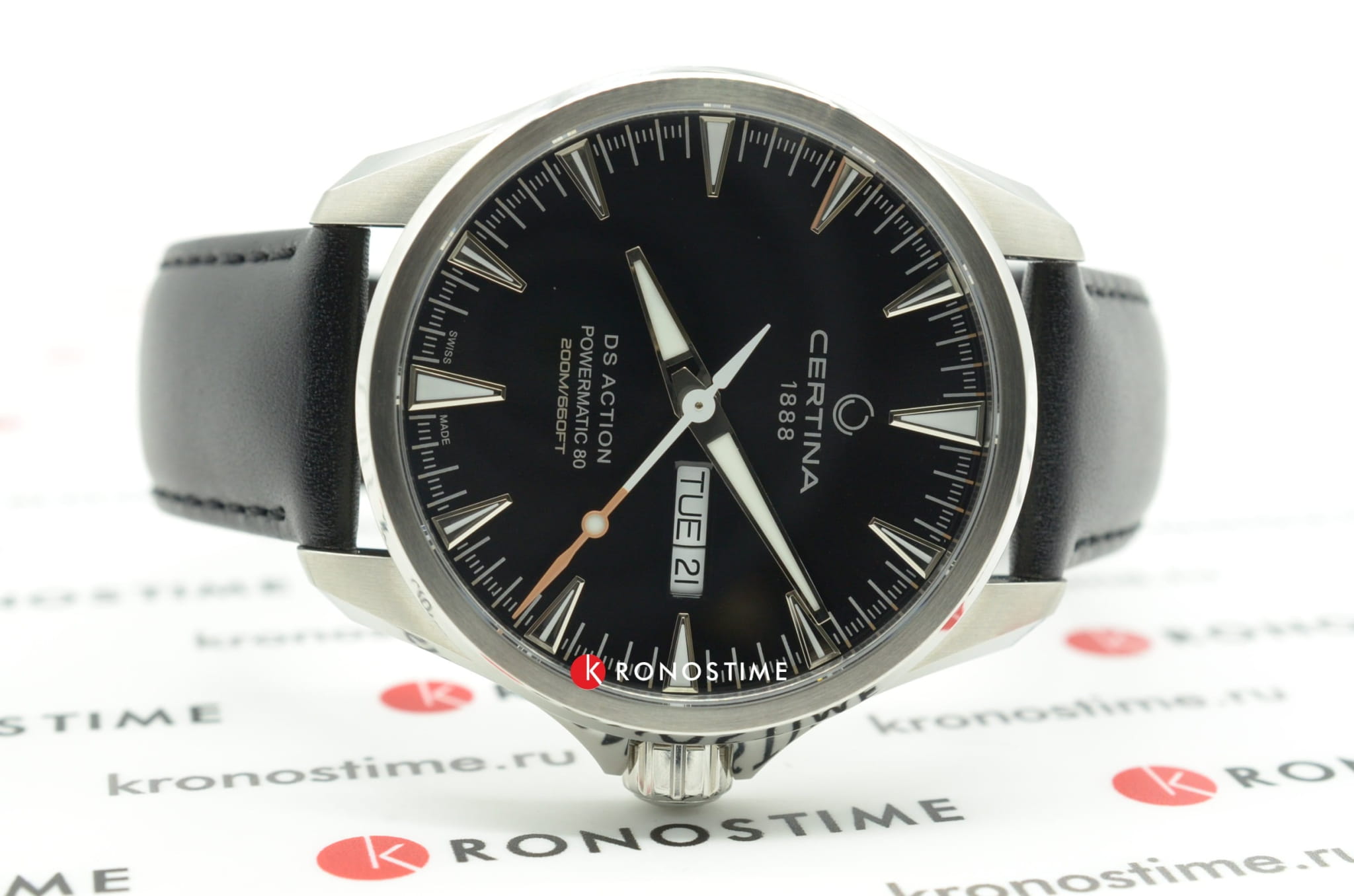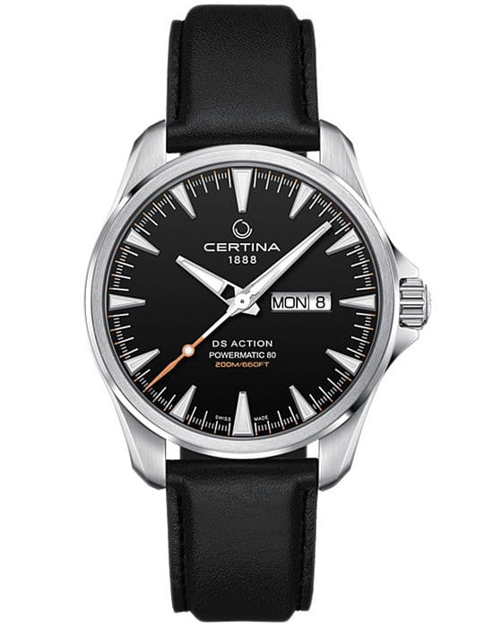 Это элегантная классика, которая безупречно дополнит повседневный, вечерний образ, поможет в создании делового имиджа. Чёрный ремешок из натуральной телячьей кожи сочетается с любой одеждой. Стальной ударопрочный корпусУдаропрочный корпусМеханизм заключён в корпус, выполненный из современных материалов, устойчивых к ударам, механическим повреждениям и падению с высоты: инновационный пластик, карбон, нержавеющая сталь, титан. защищает автоматический механизм ETA Powermatic 80Powermatic 80Эксклюзивный калибр от швейцарской компании ETA с увеличенным запасом хода до 80 часов за счёт удлинённой заводной пружины. Характеризуется улучшенной системой спуска со сниженным трением. производства Швейцарии, отличающийся резервом хода на 80 часов. Его работа отлично просматривается благодаря прозрачной задней крышке. Стекло из сапфира. Концепция DS ConceptDS ConceptDouble Security Concept, обозначает двойную надёжность и безупречную точность часов Certina. Двойная система защиты подразумевает обеспечение максимальной устойчивости к ударам и высоких показателей водонепроницаемости.. Водозащита WR 200. ЛюминесцентныеЛюминесцентное покрытиеПозволяет считывать показания времени в темноте. Производители наносят на стрелки, часовые индексы, безель или поверхность циферблата светонакопительный состав, дающий холодное свечение. стрелки и метки. Защита заводной головки. . Апертура даты и дня недели. Диаметр корпуса: 41 мм.