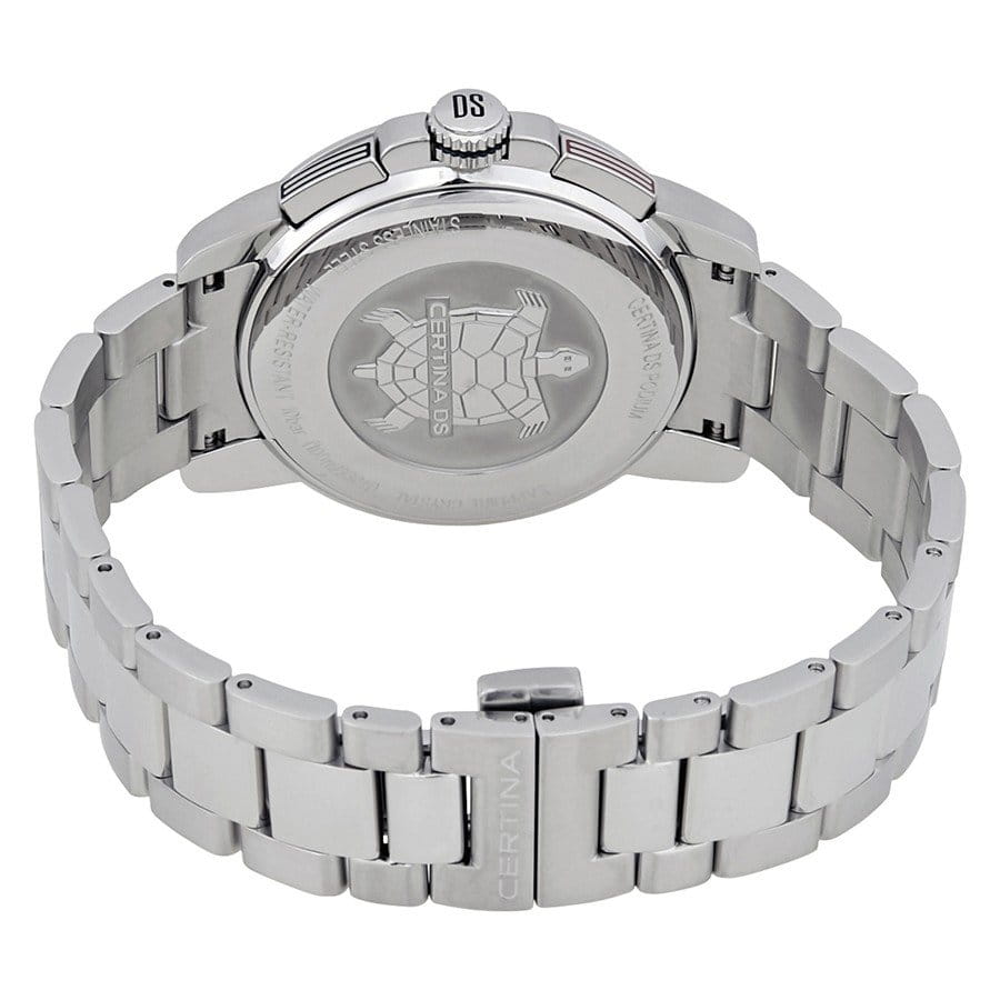 Наручные часы в спортивном стиле привлекают внимание красными деталями, что символизирует скоростное напряжение на гоночной трассе. Кварцевый швейцарский механизм ETA G10.212 Precidrive™Precidrive™Инновационный кварцевый механизм Certina. Часы, оснащённые этим швейцарским калибром, приравниваются к точности к сертифицированным хронометрам, точность хода составляет +/-10 секунд в год. с повышенной точностью хода, подтверждённой сертификатом COSCСертификат COSCОфициальный сертификат, подтверждающий то, что часы ходят с особо высокой точностью. Для получения документа часы подвергаются тестовым испытаниям, разработанным швейцарским институтом тестирования хронометров COSC. Допустимая норма для механических часов -4/+6 секунд в день, для кварцевых моделей +/- 0,07 секунд в день.. Система DS ConceptDS ConceptDouble Security Concept, обозначает двойную надёжность и безупречную точность часов Certina. Двойная система защиты подразумевает обеспечение максимальной устойчивости к ударам и высоких показателей водонепроницаемости.. Двухстороннее антибликовое покрытие для стекла из сапфира. Стрелки и индексы с составом SuperLumiNovaЛюминесцентное покрытиеПозволяет считывать показания времени в темноте. Производители наносят на стрелки, часовые индексы, безель или поверхность циферблата светонакопительный состав, дающий холодное свечение.. Заводная головка с защитой. ХронографХронографФункция позволяет измерять отрезки времени с особой точностью: часы, минуты, секунды. Верным признаком хронографа является наличие на циферблате 3 дополнительных окошек-счётчиков., шкала тахиметраТахиметрРазмеченная шкала, располагается на ободке или безеле часов. Тахиметр позволяет рассчитать скорость на определённом участке пути, расстояние измеряется в километрах или милях., календарь, секундомер, индикатор EOLEOLПредставляет собой систему, уведомляющую владельца часов о необходимости замены элемента питания. За 2 недели до полного разряда батарейки секундная стрелка перестаёт ходить чётко и начинает перепрыгивать на 3-4 деления., Lap-функция измерения промежуточного времени (круга). Диаметр корпуса: 41 мм.