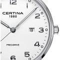 Часы выполнены в классическом дизайне, модель останется актуальной на долгие годы. Лаконичный светлый циферблат дополнен контрастными арабскими цифрами, что позволяет видеть время даже при мимолётном взгляде на запястье. Аксессуар оснащён швейцарским кварцевым калибром Precidrive™Precidrive™Инновационный кварцевый механизм Certina. Часы, оснащённые этим швейцарским калибром, приравниваются к точности к сертифицированным хронометрам, точность хода составляет +/-10 секунд в год., его точность приравнивается к сертифицированным хронометрам. Наручные часы основаны на концепции DS ConceptDS ConceptDouble Security Concept, обозначает двойную надёжность и безупречную точность часов Certina. Двойная система защиты подразумевает обеспечение максимальной устойчивости к ударам и высоких показателей водонепроницаемости., они отличаются ударопрочностью и водостойкостью до 10 бар. Сапфировое стекло имеет одностороннюю антибликовую обработку, уменьшающую отражение света в 10 раз. Стрелки дополнены люминесцентным покрытиемЛюминесцентное покрытиеПозволяет считывать показания времени в темноте. Производители наносят на стрелки, часовые индексы, безель или поверхность циферблата светонакопительный состав, дающий холодное свечение.. Для изготовления корпуса и браслета была выбрана нержавеющая сталь 316L. Функции: отображение даты, EOLEOLПредставляет собой систему, уведомляющую владельца часов о необходимости замены элемента питания. За 2 недели до полного разряда батарейки секундная стрелка перестаёт ходить чётко и начинает перепрыгивать на 3-4 деления.. Диаметр корпуса: 39 мм.
