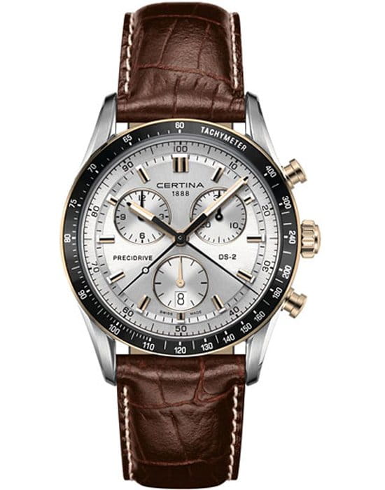 Стальной корпус оснащён алюминиевым безелемБезельВнешний ободок, закрепляющий стекло. В спортивных часах так называется поворотное кольцо с делениями на циферблате, выполняет роль таймера – замеряет отрезки времени на шкале. Неподвижный безель – элемент декора. Однонаправленно вращающийся безель на дайверских часах позволяет фиксировать моменты погружения и выныривания на поверхность.. Швейцарский кварцевый калибр ETA 251.264 Precidrive™Precidrive™Инновационный кварцевый механизм Certina. Часы, оснащённые этим швейцарским калибром, приравниваются к точности к сертифицированным хронометрам, точность хода составляет +/-10 секунд в год., способствует работе секундомера, измеряющего время с точностью до 1/100 секунды. Функции: хронографХронографФункция позволяет измерять отрезки времени с особой точностью: часы, минуты, секунды. Верным признаком хронографа является наличие на циферблате 3 дополнительных окошек-счётчиков., дата, EOLEOLПредставляет собой систему, уведомляющую владельца часов о необходимости замены элемента питания. За 2 недели до полного разряда батарейки секундная стрелка перестаёт ходить чётко и начинает перепрыгивать на 3-4 деления.. Ремешок сделан из натуральной кожи.