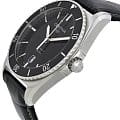 Стальной корпус оснащён чёрным керамическим безелемБезельВнешний ободок, закрепляющий стекло. В спортивных часах так называется поворотное кольцо с делениями на циферблате, выполняет роль таймера – замеряет отрезки времени на шкале. Неподвижный безель – элемент декора. Однонаправленно вращающийся безель на дайверских часах позволяет фиксировать моменты погружения и выныривания на поверхность., устойчивым к царапинам. Сапфировое стекло дополнено покрытием «антиблик». Швейцарский кварцевый механизм ETA 955.112 отличается высокой точностью хода. Кожаный ремешок надёжно обхватывает запястье.