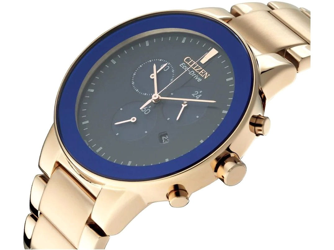 Японские наручные часы Citizen AT2243-87L сочетают в себе современный стиль и расширенные функциональные возможности. Модель выполнена в прочном корпусе из нержавеющей стали с золотистым IP-покрытиемIP-покрытиеМетод ионного напыления. Демонстрирует повышенную устойчивость к истиранию, окислению и химическим веществам. Под воздействием высокого давления и температуры около 1500°C молекулы металла надёжно соединяются с частицами корпуса часов. диаметром 43 мм и дополнена золотистым стальным браслетом с удобной раскладной застёжкойРаскладная застёжкаТакой тип застёжки используется только на браслетах из металла. Она никогда не раскрывается полностью, происходит разделение на 2 и более частей. Раскладывающая застёжка снизит вероятность потери часов к минимуму.. Синий циферблат оформлен лаконичными метками в виде штрихов, а окошко даты расположено в положении 4 часа для удобного считывания информации. Часы оснащены высокоточным кварцевым механизмом Citizen H504 с функцией хронографаХронографФункция позволяет измерять отрезки времени с особой точностью: часы, минуты, секунды. Верным признаком хронографа является наличие на циферблате 3 дополнительных окошек-счётчиков., позволяющей использовать секундомерСекундомерСекундоме́р — прибор, способный измерять интервалы времени с точностью до долей секунды. с точностью до 1 секунды и максимальным временем измерения до 1 часа. Предусмотрены 12- и 24-часовые форматы отображения времени. Благодаря инновационной системе Eco-Drive часы работают от солнечной энергии и не требуют замены батарейки, обеспечивая запас хода до 150 дней, а также оснащены функциями индикации заряда и предотвращения перезарядки. Минеральное стеклоМинеральное стеклоМинеральное стекло представляет собой искусственно выращенный минерал кварца. Такое стекло отличается особой устойчивостью к повреждениям и царапинам. Уступает по некоторым качествам сапфировому стеклу. надежно защищает циферблат от царапин, а водозащита 30WR позволяет не беспокоиться о случайных брызгах воды. Вес модели составляет 156 грамм, браслет шириной 23 мм и длиной 206,4 мм обеспечивает комфортное ношение. Эти часы станут отличным выбором для тех, кто ценит надежность, стиль и технологичность.