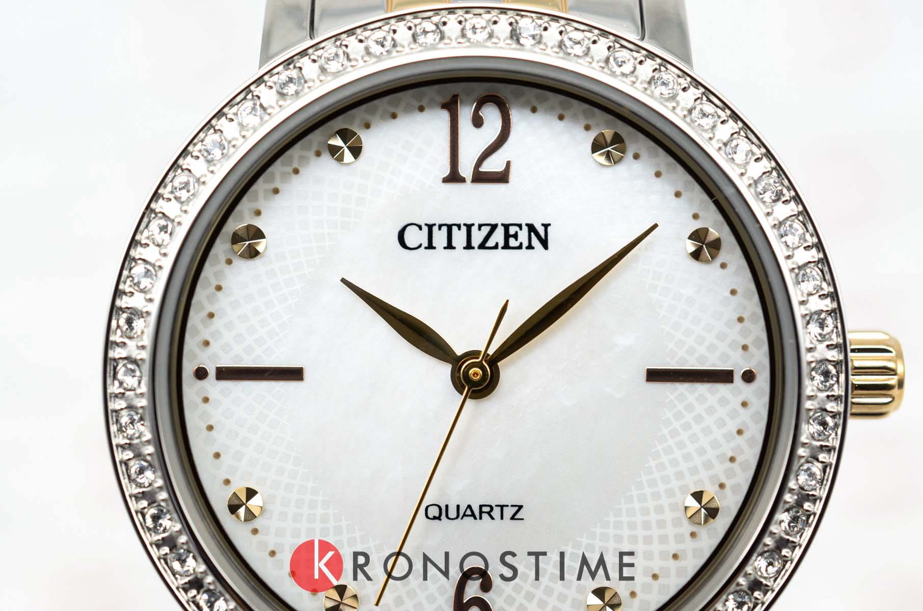 Часы Citizen EL3106-59D представляют собой элегантную модель, выполненную в Японии, сочетающую в себе современные технологии и утончённый дизайн. Корпус  изготовлен из прочной нержавеющей стали, что обеспечивает долговечность и привлекательный внешний вид. Диаметр корпуса составляет 31 мм, а толщина — всего 7 мм, что делает часы изящными и аккуратными на запястье. Особое внимание привлекает безельБезельВнешний ободок, закрепляющий стекло. В спортивных часах так называется поворотное кольцо с делениями на циферблате, выполняет роль таймера – замеряет отрезки времени на шкале. Неподвижный безель – элемент декора. Однонаправленно вращающийся безель на дайверских часах позволяет фиксировать моменты погружения и выныривания на поверхность., украшенный мерцающими кристаллами, которые придают часам особый шарм и изысканность. Надёжный кварцевый механизм гарантирует точность хода, а водозащита уровня WR 50 позволяет не снимать часы при мытье рук или во время дождя. Перламутровый циферблат украшен часовыми индексами в виде точек и цифр, а также оснащён центральными стрелками часов, минут и секунд для удобного считывания времени и кристаллами. Минеральное стеклоМинеральное стеклоМинеральное стекло представляет собой искусственно выращенный минерал кварца. Такое стекло отличается особой устойчивостью к повреждениям и царапинам. Уступает по некоторым качествам сапфировому стеклу. устойчиво к появлению мелких царапин, сохраняя прозрачность и презентабельный вид.  Стальной браслет с частичным золотистым IP-покрытиемIP-покрытиеМетод ионного напыления. Демонстрирует повышенную устойчивость к истиранию, окислению и химическим веществам. Под воздействием высокого давления и температуры около 1500°C молекулы металла надёжно соединяются с частицами корпуса часов. и раскладной застёжкойРаскладная застёжкаТакой тип застёжки используется только на браслетах из металла. Она никогда не раскрывается полностью, происходит разделение на 2 и более частей. Раскладывающая застёжка снизит вероятность потери часов к минимуму. надежно фиксирует часы на запястье, обеспечивая комфорт при ежедневном ношении.