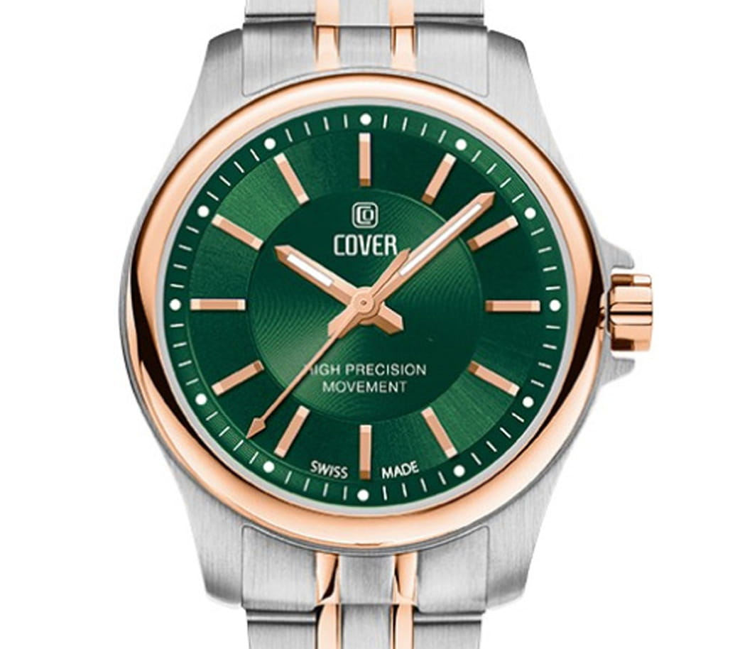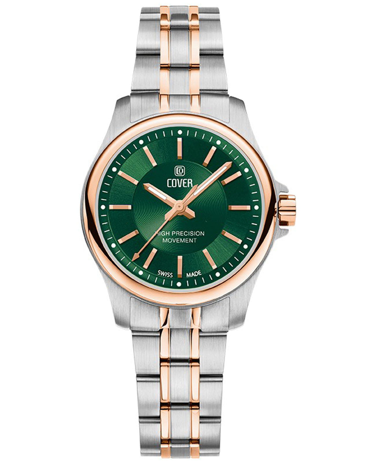 Женские наручные часы Cover CO201.33 из коллекции Marville сочетают в себе классический дизайн и высокую точность швейцарского производства. Модель обладает круглым корпусом диаметром 28 мм, изготовленным из нержавеющей стали, что придает изделию благородный внешний вид. Зеленый циферблат оснащен стрелками с люминесцентным покрытиемЛюминесцентное покрытиеПозволяет считывать показания времени в темноте. Производители наносят на стрелки, часовые индексы, безель или поверхность циферблата светонакопительный состав, дающий холодное свечение..  Для защиты используется сапфировое стеклоСапфировое стеклоПрочный и надёжный материал из кристалла сапфира синтетического происхождения, характеризующийся особой твёрдостью и устойчивостью к царапинам и повреждениям. с антибликовым покрытиемАнтибликовое покрытиеСлой оксида металла в 0,13-0,3 микрон, благодаря которому стекло часов не бликует и не отражает свет. Антибликовое покрытие уменьшает отражение света в 10 раз, обеспечивая отличную читаемость показателей циферблата., обеспечивающее прочную защиту от царапин и превосходную читаемость времени даже при ярком свете. БезельБезельВнешний ободок, закрепляющий стекло. В спортивных часах так называется поворотное кольцо с делениями на циферблате, выполняет роль таймера – замеряет отрезки времени на шкале. Неподвижный безель – элемент декора. Однонаправленно вращающийся безель на дайверских часах позволяет фиксировать моменты погружения и выныривания на поверхность. с  PVD-покрытиемPVDУльтратонкое покрытие наносится в технике вакуумного напыления, сочетает в себе нитрид титана особой прочности со слоем золота или оксида хрома. Несёт в себе декоративную или защитную функцию. цвета розового золота. Часы работают на высокоточном кварцевом механизме ETA, гарантирующем исключительную точность хода с погрешностью около 20 секунд в месяц. Браслет выполнен из нержавеющей стали с частичным PVD-покрытиемPVDУльтратонкое покрытие наносится в технике вакуумного напыления, сочетает в себе нитрид титана особой прочности со слоем золота или оксида хрома. Несёт в себе декоративную или защитную функцию. и оснащен раскладной застежкойРаскладная застёжкаТакой тип застёжки используется только на браслетах из металла. Она никогда не раскрывается полностью, происходит разделение на 2 и более частей. Раскладывающая застёжка снизит вероятность потери часов к минимуму., обеспечивающей комфортное ношение и безопасность. Водонепроницаемость достигает 10 атмосфер (100 метров), что позволяет использовать их во время плавания и других водных видов спорта, однако не рекомендуется для глубоководного дайвинга. Эти швейцарские часы станут идеальным дополнением как классического, так и современного образа.