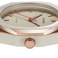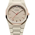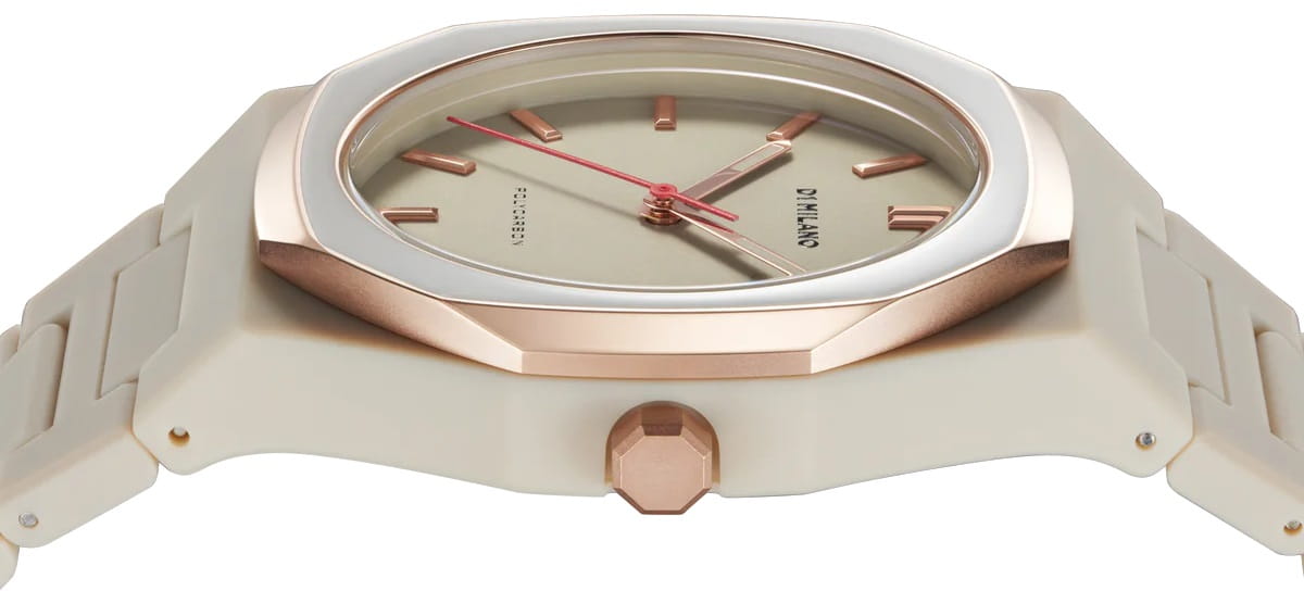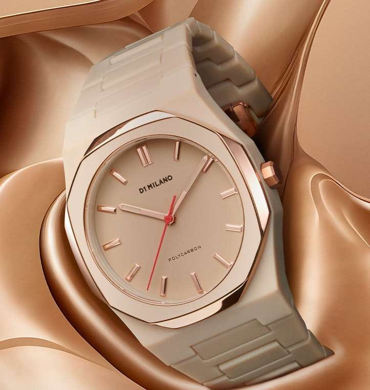 Часы D1 Milano Polycarbon PCBJ36 – молодежные часы в стиле унисекс для повседневных образов. Модель Taupe Mesh имеет бежевый корпус из поликарбоната с покрытием Софт-Тач и блестящий золотистый безельБезельВнешний ободок, закрепляющий стекло. В спортивных часах так называется поворотное кольцо с делениями на циферблате, выполняет роль таймера – замеряет отрезки времени на шкале. Неподвижный безель – элемент декора. Однонаправленно вращающийся безель на дайверских часах позволяет фиксировать моменты погружения и выныривания на поверхность.. Монохромная цветовая гамма тауп, смешанная с розовым золотым покрытием, придает безелю премиальный и изысканный вид. Циферблат лаконичный с индексами в виде штрихов, защищен минеральным стекломМинеральное стеклоМинеральное стекло представляет собой искусственно выращенный минерал кварца. Такое стекло отличается особой устойчивостью к повреждениям и царапинам. Уступает по некоторым качествам сапфировому стеклу. с антибликовым покрытием. Стальная задняя крышка на 4 винтах. Пластиковый браслет на застёжке «бабочка» с кнопкамиЗастёжка "бабочка"Такой вид застёжки дополняется предохранителями, помогающими избежать случайного раскрытия браслета. Обладают изящным исполнением. .