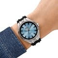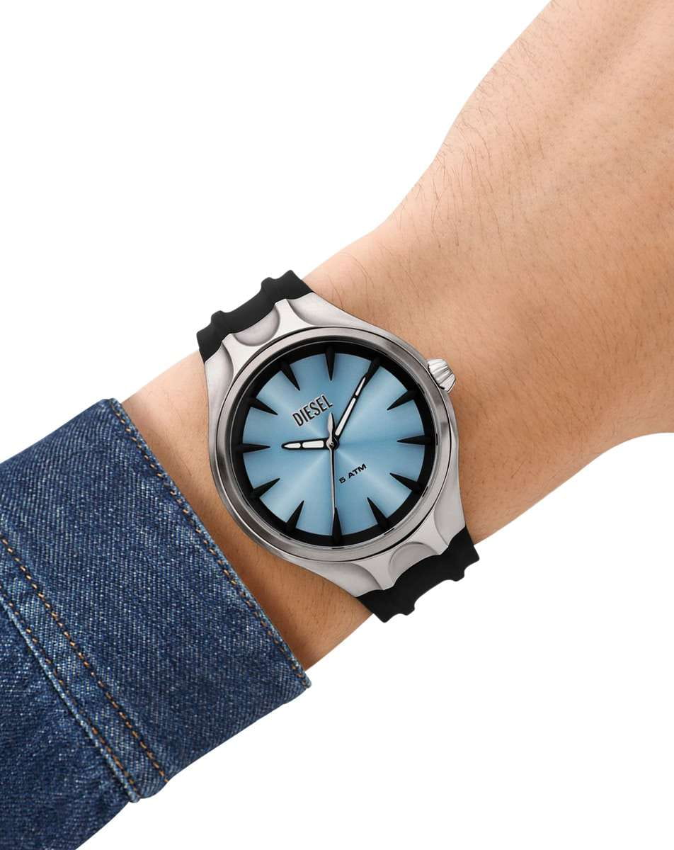 Дизайнерские часы Diesel Streamline DZ2216 представляют собой стильный аксессуар, который великолепно подчеркивает индивидуальность и вкус своего владельца. Они оснащены кварцевым механизмом, обеспечивающим высокую точность хода. Круглый корпус выполнен из нержавеющей стали с сочетанием матовых и полированных деталей, дополненных черным покрытием, что придает часам современный и элегантный вид. Голубой циферблат, украшенный логотипом бренда, изготовлен по технологии Sunray, создающей эффект солнечных лучей, и надежно защищен минеральным стекломМинеральное стеклоМинеральное стекло представляет собой искусственно выращенный минерал кварца. Такое стекло отличается особой устойчивостью к повреждениям и царапинам. Уступает по некоторым качествам сапфировому стеклу.. Метки на циферблате выполнены в виде штрихов, что добавляет изысканности дизайну. Рифленая заводная головка обеспечивает удобство в настройке времени. Для комфортного ношения предусмотрен силиконовый ремешок с классической застежкой. Часы обладают классом водозащиты 5 бар (50 метров), что позволяет не беспокоиться о попадании воды при мытье рук или прогулке под дождем. Стрелки с люминесцентным покрытиемЛюминесцентное покрытиеПозволяет считывать показания времени в темноте. Производители наносят на стрелки, часовые индексы, безель или поверхность циферблата светонакопительный состав, дающий холодное свечение. обеспечивают удобное считывание времени в темноте после кратковременного пребывания на свету, что делает эти часы практичными в любых условиях.