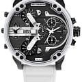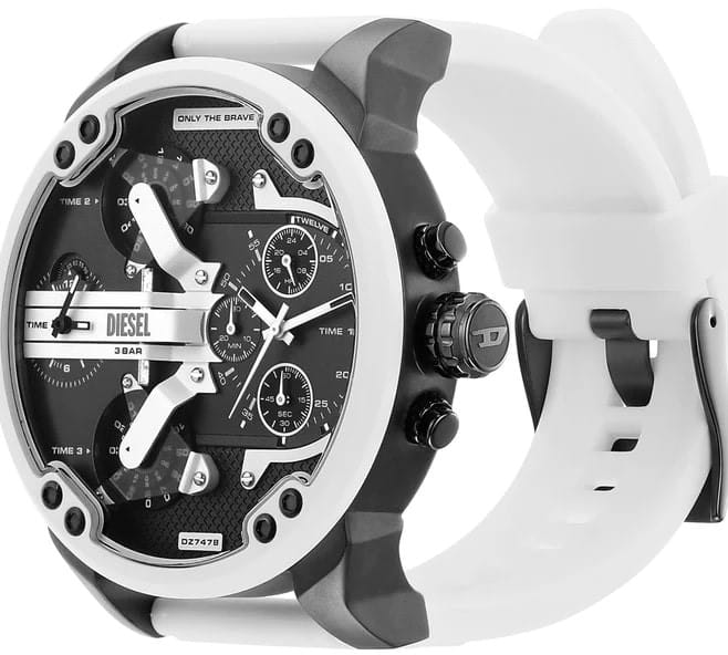 Мужские американские часы-хронографХронографФункция позволяет измерять отрезки времени с особой точностью: часы, минуты, секунды. Верным признаком хронографа является наличие на циферблате 3 дополнительных окошек-счётчиков. с секундомеромСекундомерСекундоме́р — прибор, способный измерять интервалы времени с точностью до долей секунды. Diesel Mr Daddy 2.0 DZ7478, кварцевый механизм с высокой точностью. Класс водозащиты: 30 метров, позволит защитить корпус от случайных брызг или капель дождя. Корпус часов изготовлен из стали с IP-покрытиемIP-покрытиеМетод ионного напыления. Демонстрирует повышенную устойчивость к истиранию, окислению и химическим веществам. Под воздействием высокого давления и температуры около 1500°C молекулы металла надёжно соединяются с частицами корпуса часов.. Силиконовый ремешок на стандартной застёжке. БезельБезельВнешний ободок, закрепляющий стекло. В спортивных часах так называется поворотное кольцо с делениями на циферблате, выполняет роль таймера – замеряет отрезки времени на шкале. Неподвижный безель – элемент декора. Однонаправленно вращающийся безель на дайверских часах позволяет фиксировать моменты погружения и выныривания на поверхность. с IP-покрытиемIP-покрытиеМетод ионного напыления. Демонстрирует повышенную устойчивость к истиранию, окислению и химическим веществам. Под воздействием высокого давления и температуры около 1500°C молекулы металла надёжно соединяются с частицами корпуса часов.. 12-ти и 24-х часовой формат времени. Счетчики на 60 секунд и 30 минут. Окошко даты. Четыре часовых пояса. Четыре механизма, на двух из которых указатели часов и минут в виде вращающихся дисков, на третьем - указатель секунд. Завинчивающаяся задняя крышка.