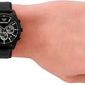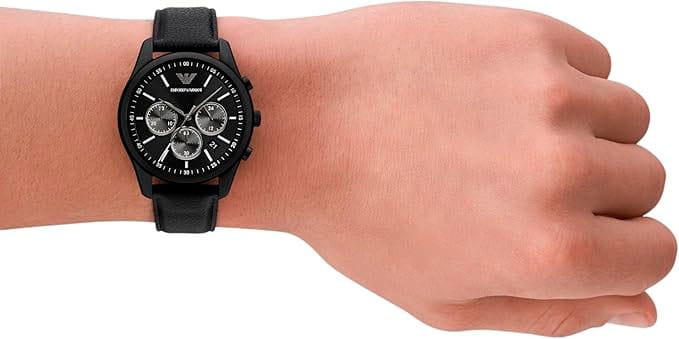 Мужские часы Emporio Armani Antonio AR11583 - стильные с кварцевым механизмом сочетают в себе элегантность и функциональность, что делает их идеальным аксессуаром для современного мужчины. Корпус часов из нержавеющей стали с черным IP-покрытиемIP-покрытиеМетод ионного напыления. Демонстрирует повышенную устойчивость к истиранию, окислению и химическим веществам. Под воздействием высокого давления и температуры около 1500°C молекулы металла надёжно соединяются с частицами корпуса часов., что обеспечивает долговечность и устойчивость к внешним воздействиям. Минеральное стеклоМинеральное стеклоМинеральное стекло представляет собой искусственно выращенный минерал кварца. Такое стекло отличается особой устойчивостью к повреждениям и царапинам. Уступает по некоторым качествам сапфировому стеклу. защищает черный циферблат, добавляя изысканности всей конструкции. Размер корпуса составляет 41 мм, что придаёт часам солидный внешний вид, не утяжеляя при этом запястье. Часы имеют водонепроницаемость WR50 (5 атм), это позволяет использовать их в повседневной жизни, не опасаясь воздействия воды. Кожаный черный ремешок с классической застежкой обеспечивает комфортное и надёжное крепление на запястье.  Этот хронографХронографФункция позволяет измерять отрезки времени с особой точностью: часы, минуты, секунды. Верным признаком хронографа является наличие на циферблате 3 дополнительных окошек-счётчиков. с функцией секундомераСекундомерСекундоме́р — прибор, способный измерять интервалы времени с точностью до долей секунды. и календарем, отображающим дату, станет идеальным аксессуаром для тех, кто ценит функциональность и итальянское качество.