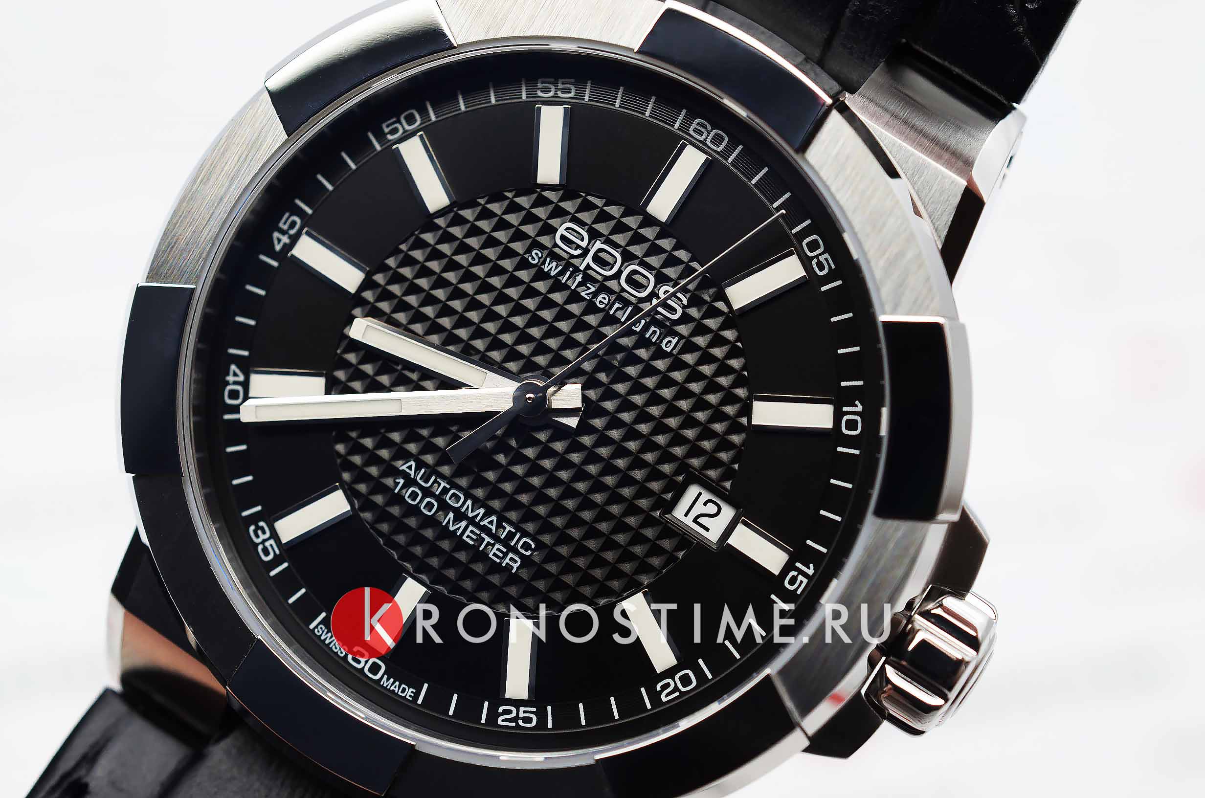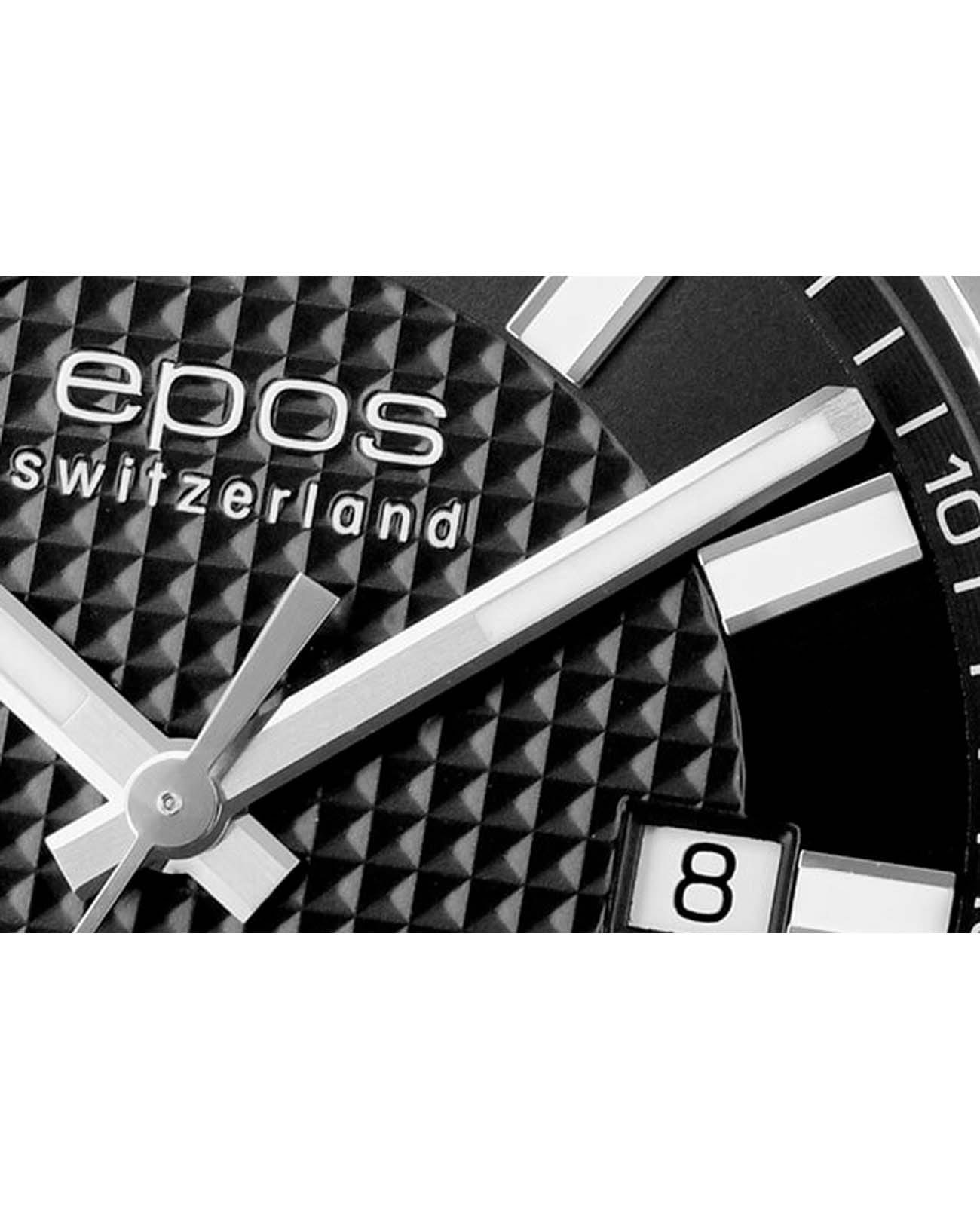 Мужские механические часы с автоподзаводом Epos из коллекции Sportive — это стильный аксессуар с швейцарским качеством и современным дизайном. Корпус диаметром 43,8 мм и толщиной 10,6 мм выполнен из нержавеющей стали 316L. Циферблат чёрного цвета оформлен метками и стрелками с люминесцентным покрытиемЛюминесцентное покрытиеПозволяет считывать показания времени в темноте. Производители наносят на стрелки, часовые индексы, безель или поверхность циферблата светонакопительный состав, дающий холодное свечение., обеспечивающим хорошую читаемость в темноте. Циферблат защищён сапфировым стекломСапфировое стеклоПрочный и надёжный материал из кристалла сапфира синтетического происхождения, характеризующийся особой твёрдостью и устойчивостью к царапинам и повреждениям.. Механизм — швейцарский калибр ETA 2824 с запасом хода 38 часов. Окошко даты расположено в положении 3 часов. Прозрачная задняя крышка позволяет наблюдать за работой декорированного механизма. Часы оснащены кожаным ремешком чёрного цвета с стандартной застёжкой. Водонепроницаемость 100 м позволяет использовать часы для плавания и повседневного ношения. Гарантия — 24 месяца. Универсальный выбор для ценителя механики и элегантного стиля.