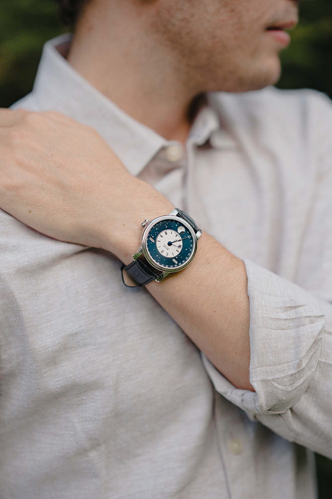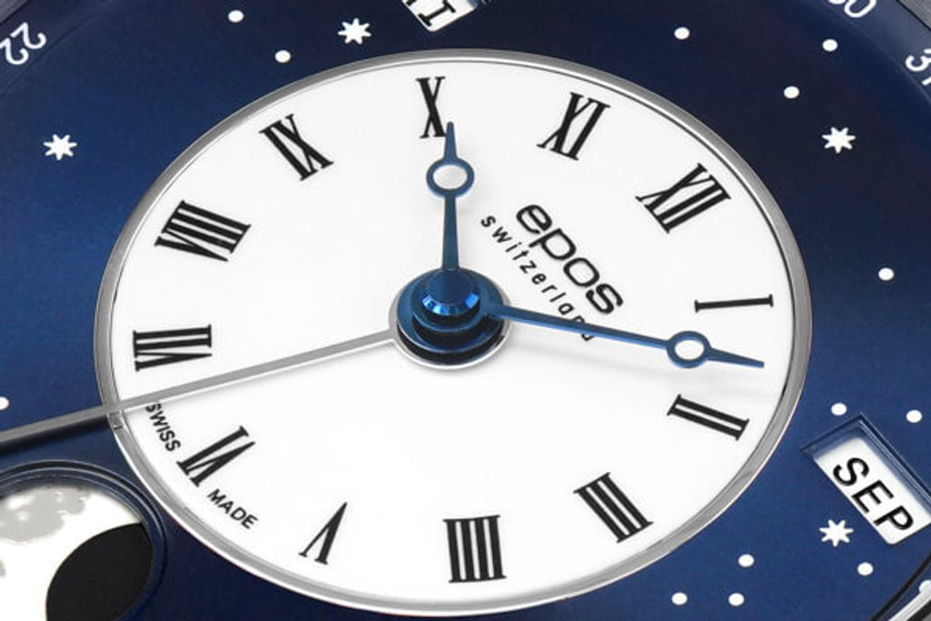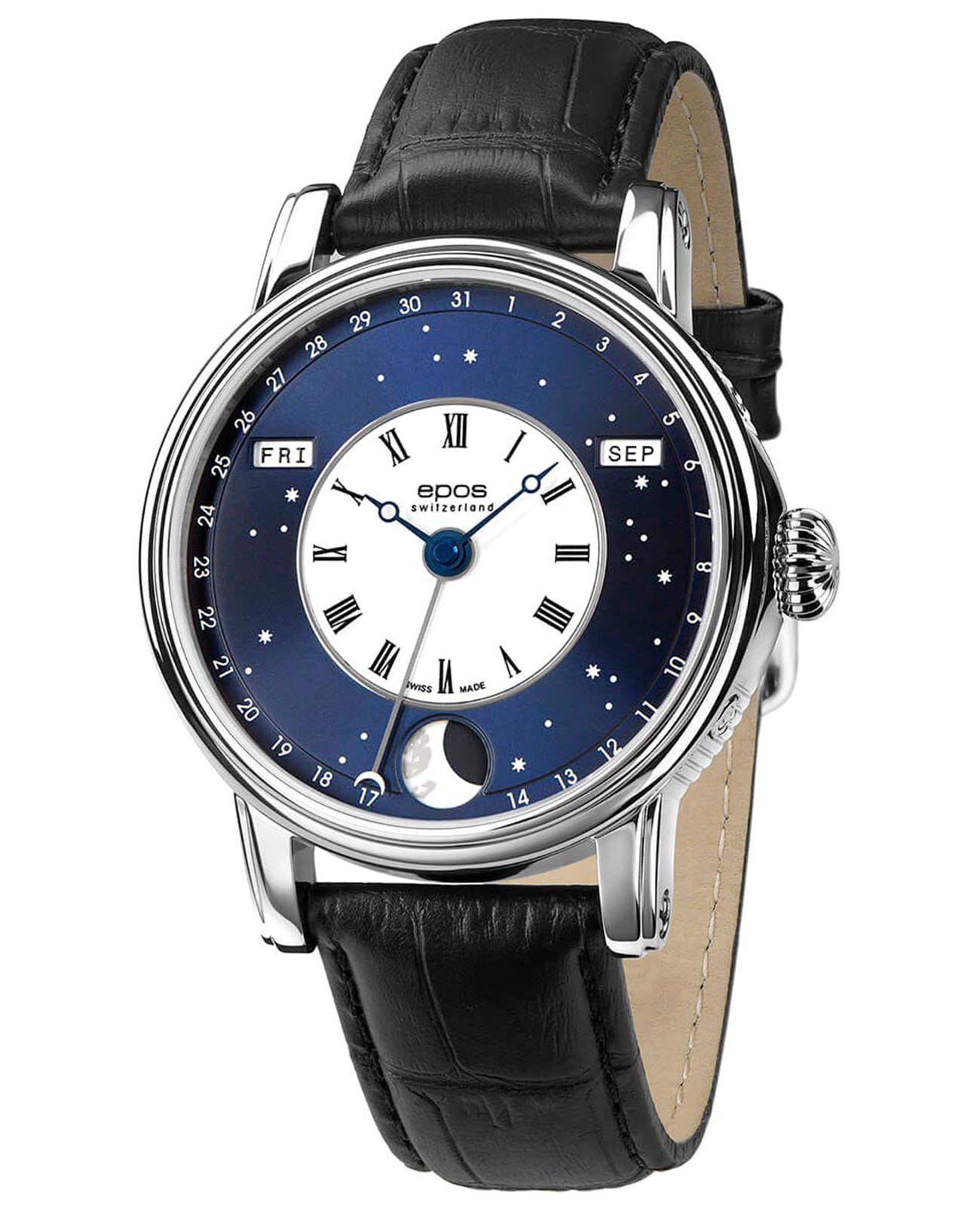 Мужские швейцарские механические часы с автоподзаводом Epos Oeuvre d'art 3439.322.20.26.25. Сапфировое стеклоСапфировое стеклоПрочный и надёжный материал из кристалла сапфира синтетического происхождения, характеризующийся особой твёрдостью и устойчивостью к царапинам и повреждениям. устойчивое к появлению царапин, обладающее высокой прозрачностью. Корпус часов изготовлен из нержавеющей стали. В механизме 25 камней, частота 28800 полуколебаний в час. Запас хода 42 часа. Механизм декорирован узором Cotes de Geneve. Циферблат выполнен по технологии Sunray (солнечные лучи). В центре циферблат дополнен изображением ночного неба со светящимися звездами и большой светящейся луной с люминесцентной подсветкойЛюминесцентное покрытиеПозволяет считывать показания времени в темноте. Производители наносят на стрелки, часовые индексы, безель или поверхность циферблата светонакопительный состав, дающий холодное свечение.. Накладные метки в виде штрихов. Дата отображается центральной стрелкой. Окошко дня недели и месяца. Автоматический указатель фазы луны. Винтажная заводная головка. Прозрачная задняя крышка. Класс водозащиты: 50 метров, позволит защитить корпус от случайных брызг или капель дождя. Кожаный ремешок на стандартной застёжке.
