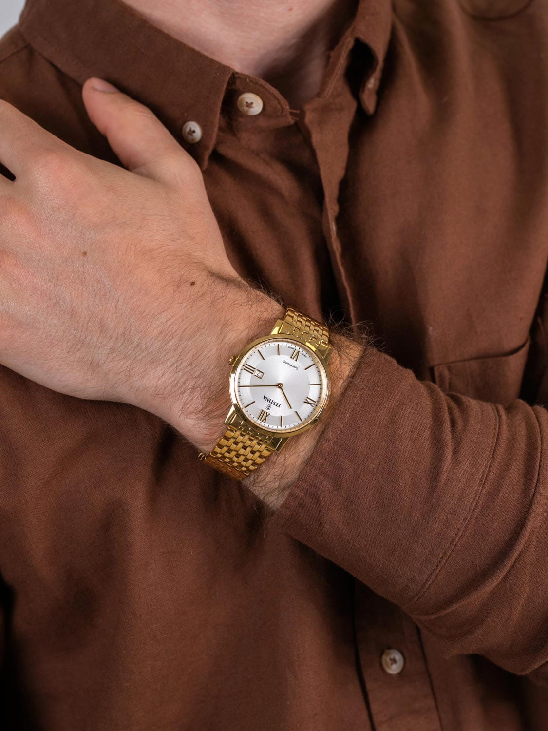 Наручные мужские часы с окошком даты, кварцевый механизм с высокой точностью. Метки в виде арабских цифр. Окошко даты находится в положении 3 часа. Класс водозащиты: 50 метров, позволит защитить часы от случайных брызг воды. Циферблат защищен сапфировым стекломСапфировое стеклоПрочный и надёжный материал из кристалла сапфира синтетического происхождения, характеризующийся особой твёрдостью и устойчивостью к царапинам и повреждениям., устойчивым к появлению царапин и обладающим высокой прозрачностью. Часы на классической раскладной застёжкеРаскладная застёжкаТакой тип застёжки используется только на браслетах из металла. Она никогда не раскрывается полностью, происходит разделение на 2 и более частей. Раскладывающая застёжка снизит вероятность потери часов к минимуму.. Корпус и браслет с PVD-покрытиемPVDУльтратонкое покрытие наносится в технике вакуумного напыления, сочетает в себе нитрид титана особой прочности со слоем золота или оксида хрома. Несёт в себе декоративную или защитную функцию..
