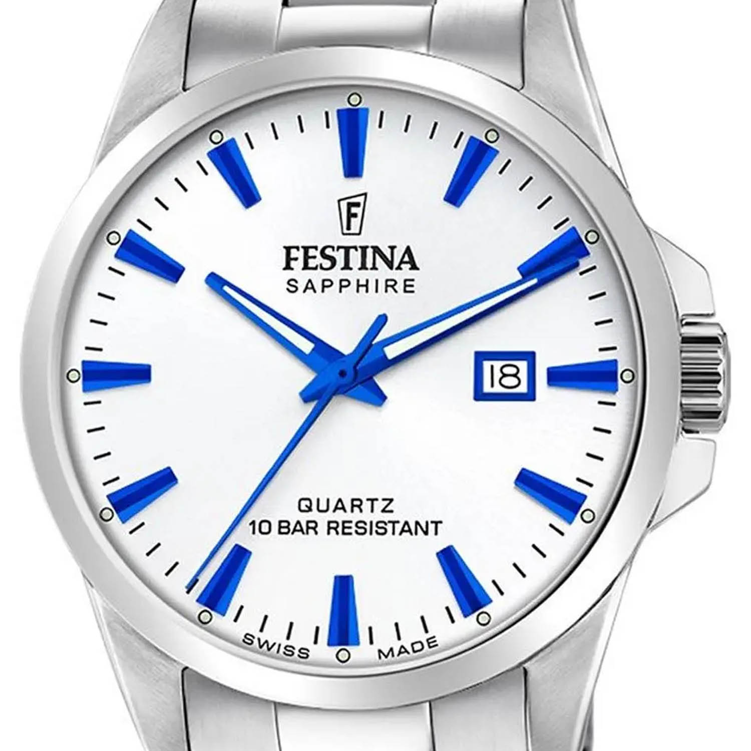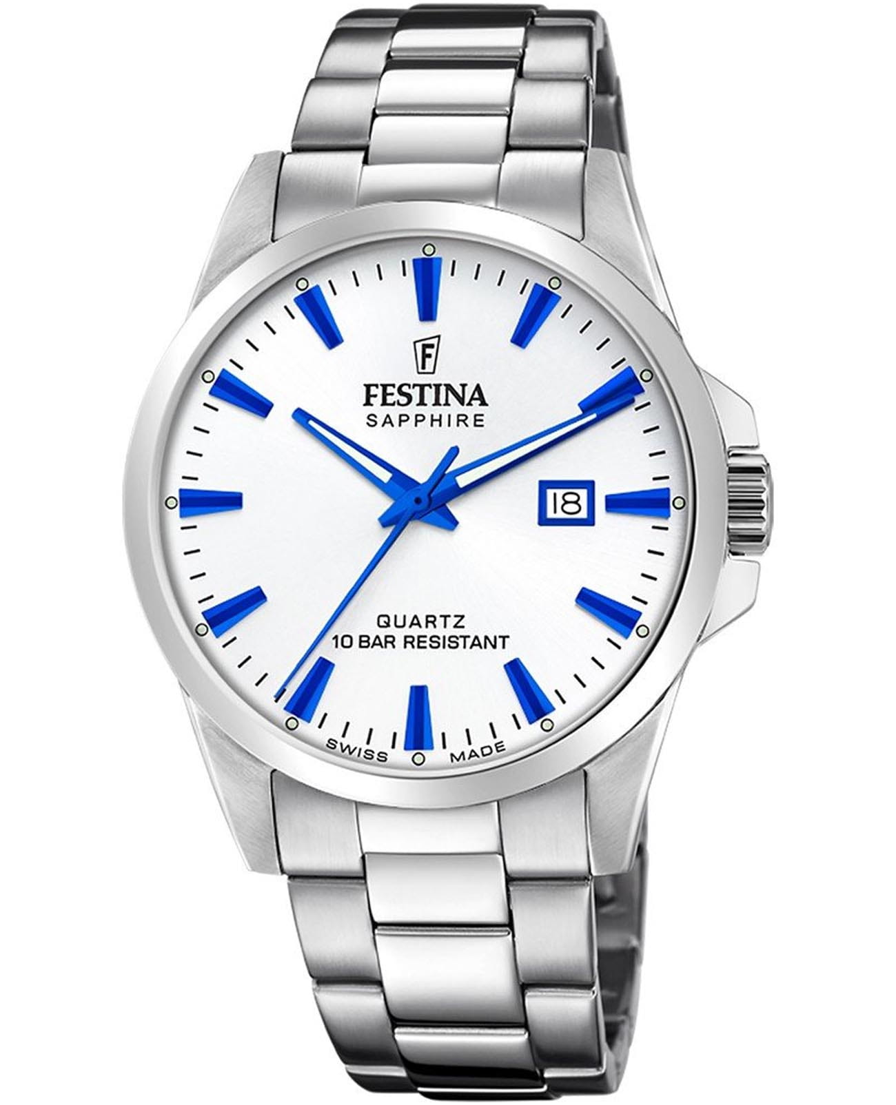 Практичные и стильные часы Festina F20024/5 с круглым корпусом на стальном браслете идеальны для современного ритма жизни. Кварцевый механизм с высокой точностью. Сапфировое стеклоСапфировое стеклоПрочный и надёжный материал из кристалла сапфира синтетического происхождения, характеризующийся особой твёрдостью и устойчивостью к царапинам и повреждениям. устойчивое к появлению царапин, обладающее высокой прозрачностью. Класс водозащиты: 100 метров, позволит плавать, нырять и заниматься другими водными видами спорта. Корпус часов изготовлен из нержавеющей стали. Браслет с раскладной застёжкойРаскладная застёжкаТакой тип застёжки используется только на браслетах из металла. Она никогда не раскрывается полностью, происходит разделение на 2 и более частей. Раскладывающая застёжка снизит вероятность потери часов к минимуму.. Окошко даты находится в положении 3 часа. Стрелки и метки с люминесцентным покрытиемЛюминесцентное покрытиеПозволяет считывать показания времени в темноте. Производители наносят на стрелки, часовые индексы, безель или поверхность циферблата светонакопительный состав, дающий холодное свечение..