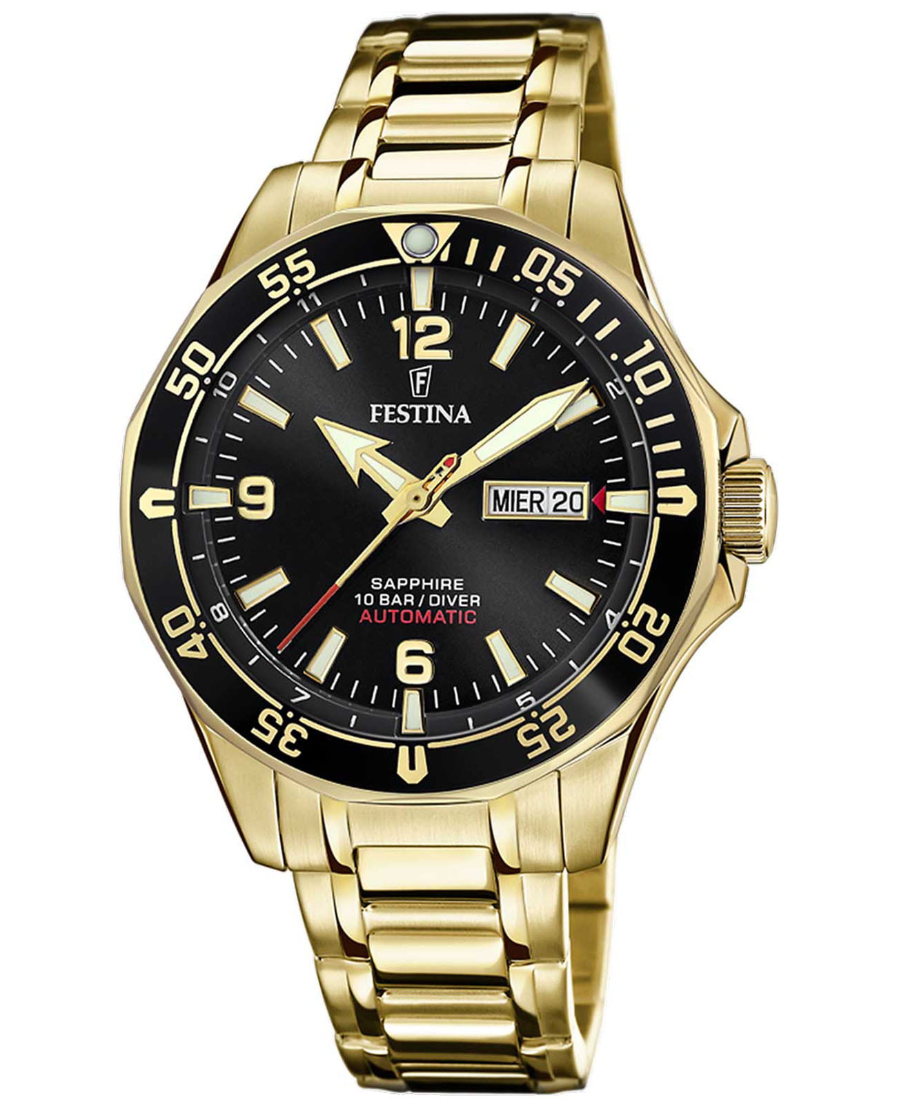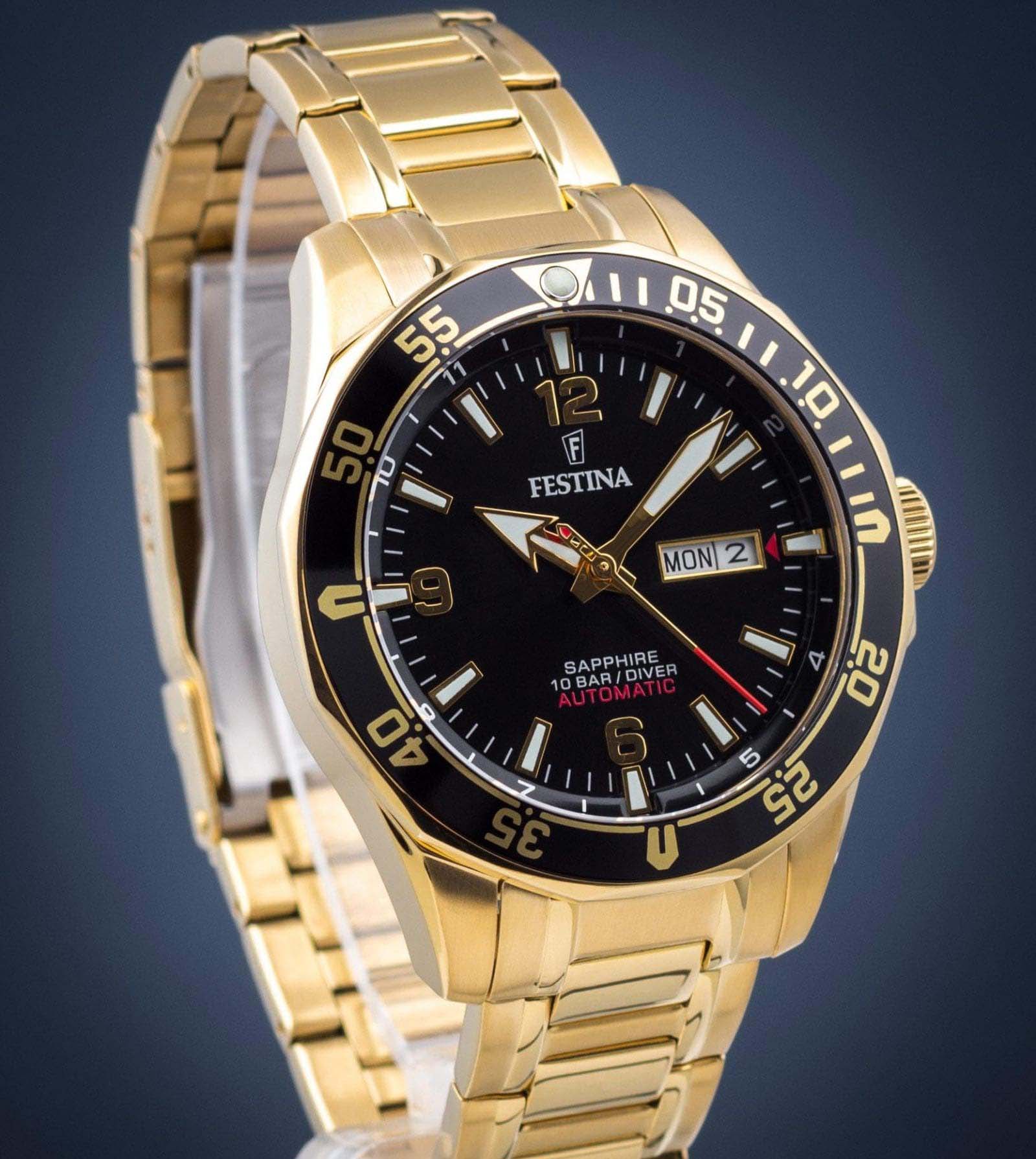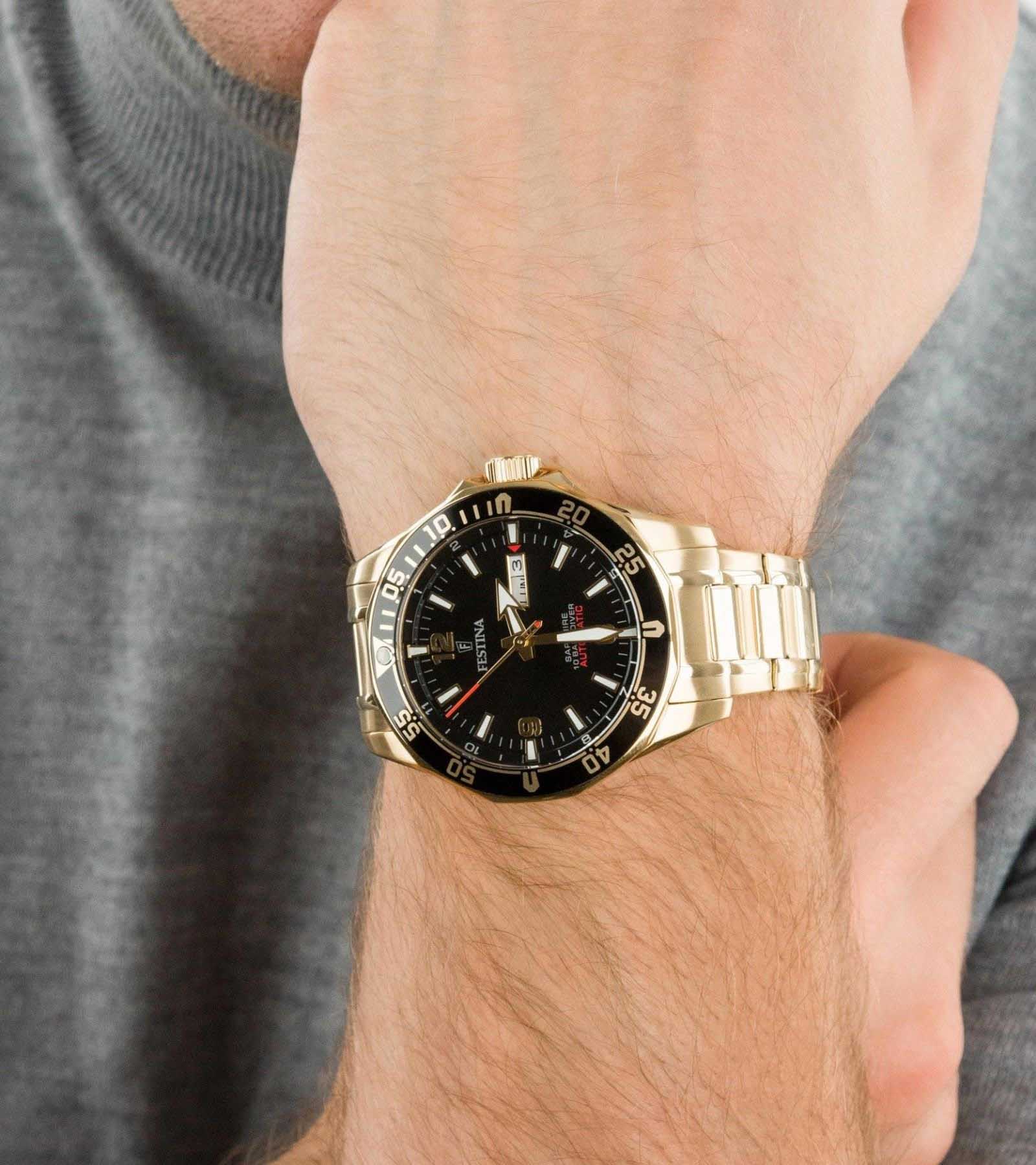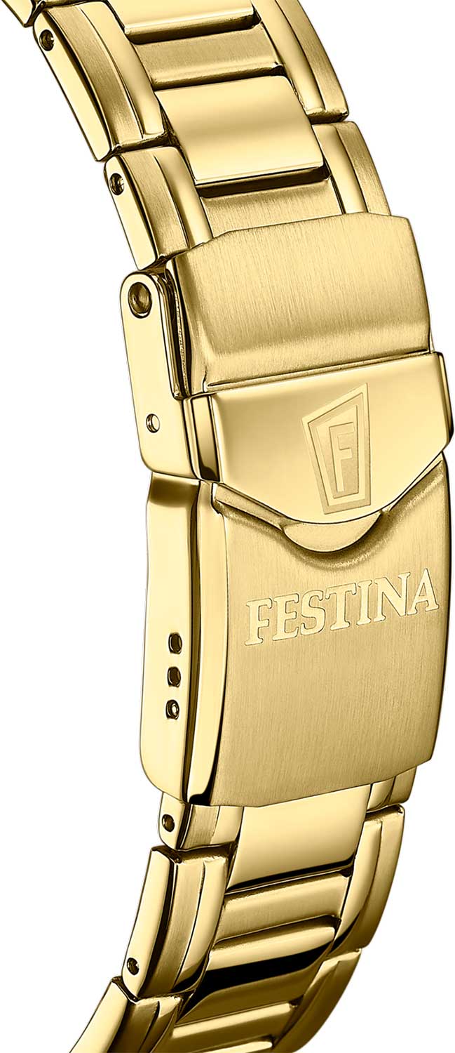Мужские механические часы Festina Automatic F20479/4, механический механизм (автоматический калибр) с высокой точностью. Сапфировое стеклоСапфировое стеклоПрочный и надёжный материал из кристалла сапфира синтетического происхождения, характеризующийся особой твёрдостью и устойчивостью к царапинам и повреждениям. устойчивое к появлению царапин, обладающее высокой прозрачностью. Класс водозащиты: 100 метров, позволит плавать, нырять и заниматься другими водными видами спорта. Корпус часов изготовлен из стали с IP-покрытиемIP-покрытиеМетод ионного напыления. Демонстрирует повышенную устойчивость к истиранию, окислению и химическим веществам. Под воздействием высокого давления и температуры около 1500°C молекулы металла надёжно соединяются с частицами корпуса часов.. Стальной браслет на раскладной застёжкеРаскладная застёжкаТакой тип застёжки используется только на браслетах из металла. Она никогда не раскрывается полностью, происходит разделение на 2 и более частей. Раскладывающая застёжка снизит вероятность потери часов к минимуму. с IP-покрытиемIP-покрытиеМетод ионного напыления. Демонстрирует повышенную устойчивость к истиранию, окислению и химическим веществам. Под воздействием высокого давления и температуры около 1500°C молекулы металла надёжно соединяются с частицами корпуса часов.. Окошки дня недели и даты находятся в положении 3 часа. БезельБезельВнешний ободок, закрепляющий стекло. В спортивных часах так называется поворотное кольцо с делениями на циферблате, выполняет роль таймера – замеряет отрезки времени на шкале. Неподвижный безель – элемент декора. Однонаправленно вращающийся безель на дайверских часах позволяет фиксировать моменты погружения и выныривания на поверхность. с IP-покрытиемIP-покрытиеМетод ионного напыления. Демонстрирует повышенную устойчивость к истиранию, окислению и химическим веществам. Под воздействием высокого давления и температуры около 1500°C молекулы металла надёжно соединяются с частицами корпуса часов.. Стрелки и метки с люминесцентным покрытиемЛюминесцентное покрытиеПозволяет считывать показания времени в темноте. Производители наносят на стрелки, часовые индексы, безель или поверхность циферблата светонакопительный состав, дающий холодное свечение..