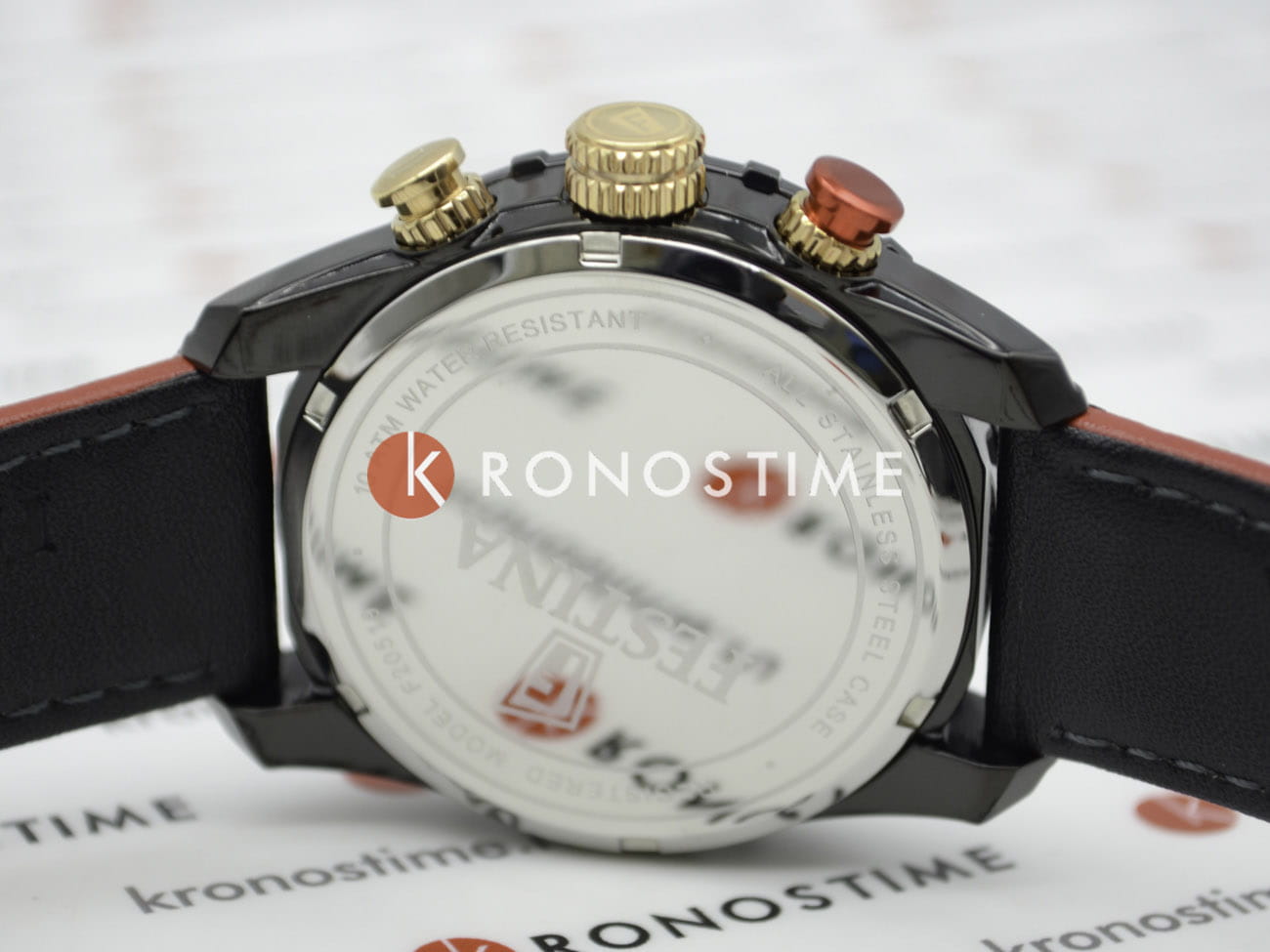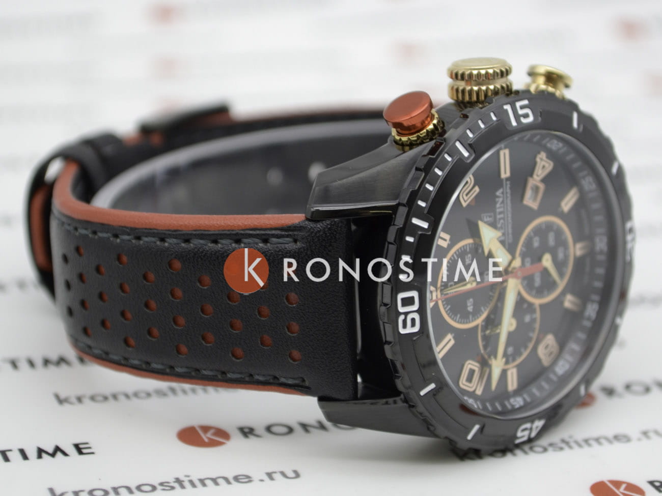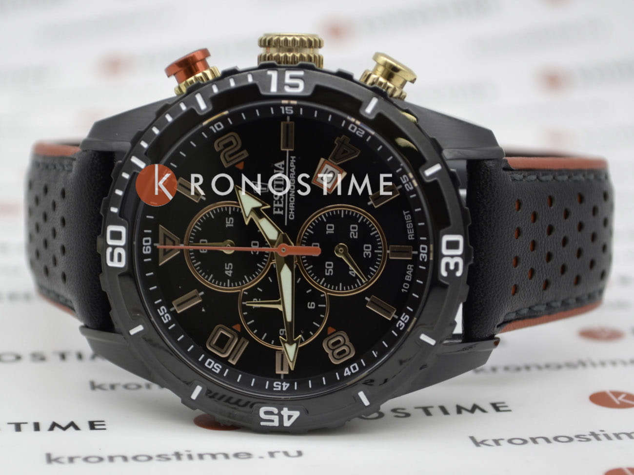 Часы-хронографХронографФункция позволяет измерять отрезки времени с особой точностью: часы, минуты, секунды. Верным признаком хронографа является наличие на циферблате 3 дополнительных окошек-счётчиков.. Кварцевый механизм с высокой точностью. Минеральное стеклоМинеральное стеклоМинеральное стекло представляет собой искусственно выращенный минерал кварца. Такое стекло отличается особой устойчивостью к повреждениям и царапинам. Уступает по некоторым качествам сапфировому стеклу. устойчивое к появлению царапин, обладающее высокой прозрачностью. Класс водозащиты: 100 метров, позволит плавать, нырять и заниматься другими водными видами спорта. Стрелки и метки с люминесцентным покрытиемЛюминесцентное покрытиеПозволяет считывать показания времени в темноте. Производители наносят на стрелки, часовые индексы, безель или поверхность циферблата светонакопительный состав, дающий холодное свечение.. Корпус часов изготовлен из нержавеющей стали c PVD-покрытиемPVDУльтратонкое покрытие наносится в технике вакуумного напыления, сочетает в себе нитрид титана особой прочности со слоем золота или оксида хрома. Несёт в себе декоративную или защитную функцию.. Кожаный ремешок с классической застежкой.