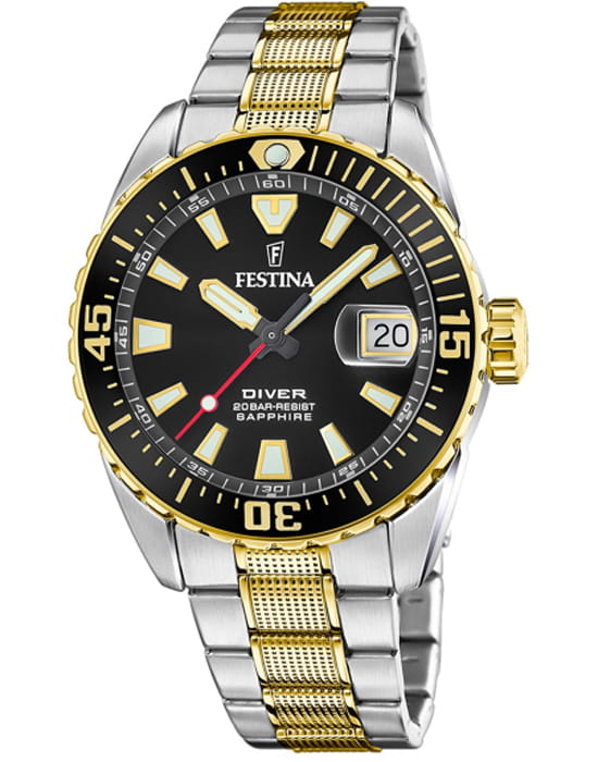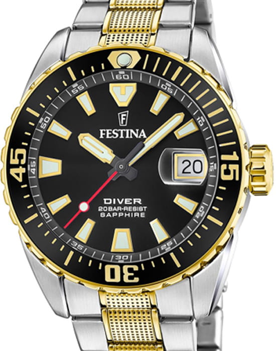 Мужские часы Festina The Originals F20706/3, кварцевый механизм с высокой точностью. Сапфировое стеклоСапфировое стеклоПрочный и надёжный материал из кристалла сапфира синтетического происхождения, характеризующийся особой твёрдостью и устойчивостью к царапинам и повреждениям. устойчивое к появлению царапин, обладающее высокой прозрачностью. Класс водозащиты: 200 метров, позволит плавать, нырять и заниматься другими водными видами спорта. Корпус часов изготовлен из нержавеющей стали 316L. Стальной браслет на раскладной застёжкеРаскладная застёжкаТакой тип застёжки используется только на браслетах из металла. Она никогда не раскрывается полностью, происходит разделение на 2 и более частей. Раскладывающая застёжка снизит вероятность потери часов к минимуму. с частичным PVD-покрытиемPVDУльтратонкое покрытие наносится в технике вакуумного напыления, сочетает в себе нитрид титана особой прочности со слоем золота или оксида хрома. Несёт в себе декоративную или защитную функцию.. Окошко даты находится в положении 3 часа. Вращающийся стальной безельБезельВнешний ободок, закрепляющий стекло. В спортивных часах так называется поворотное кольцо с делениями на циферблате, выполняет роль таймера – замеряет отрезки времени на шкале. Неподвижный безель – элемент декора. Однонаправленно вращающийся безель на дайверских часах позволяет фиксировать моменты погружения и выныривания на поверхность. с PVD-покрытиемPVDУльтратонкое покрытие наносится в технике вакуумного напыления, сочетает в себе нитрид титана особой прочности со слоем золота или оксида хрома. Несёт в себе декоративную или защитную функцию.. Стрелки и метки с люминесцентным покрытиемЛюминесцентное покрытиеПозволяет считывать показания времени в темноте. Производители наносят на стрелки, часовые индексы, безель или поверхность циферблата светонакопительный состав, дающий холодное свечение..