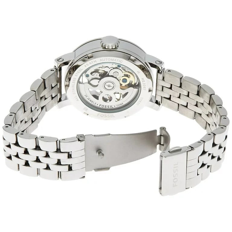 Женские механические наручные часы с автоподзаводом Fossil Original Boyfriend Automatic ME3067. Корпус часов изготовлен из нержавеющей стали. Минеральное стеклоМинеральное стеклоМинеральное стекло представляет собой искусственно выращенный минерал кварца. Такое стекло отличается особой устойчивостью к повреждениям и царапинам. Уступает по некоторым качествам сапфировому стеклу. устойчивое к появлению царапин, обладающее высокой прозрачностью. Водозащита: 50 метров, позволит защитить корпус от случайных брызг или капель дождя. Стальной браслет на раскладной застёжкеРаскладная застёжкаТакой тип застёжки используется только на браслетах из металла. Она никогда не раскрывается полностью, происходит разделение на 2 и более частей. Раскладывающая застёжка снизит вероятность потери часов к минимуму.. Стрелки с люминесцентным покрытиемЛюминесцентное покрытиеПозволяет считывать показания времени в темноте. Производители наносят на стрелки, часовые индексы, безель или поверхность циферблата светонакопительный состав, дающий холодное свечение..