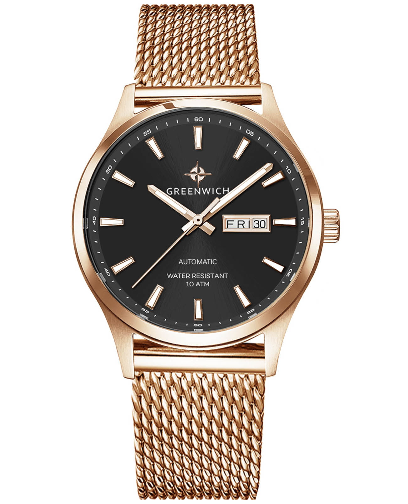Мужские часы Greenwich Good Luck GW 054.49.31, механический механизм (автоматический калибр) с высокой точностью. Классический круглый стальной корпус с PVD-покрытиемPVDУльтратонкое покрытие наносится в технике вакуумного напыления, сочетает в себе нитрид титана особой прочности со слоем золота или оксида хрома. Несёт в себе декоративную или защитную функцию., защищенный минеральным стекломМинеральное стеклоМинеральное стекло представляет собой искусственно выращенный минерал кварца. Такое стекло отличается особой устойчивостью к повреждениям и царапинам. Уступает по некоторым качествам сапфировому стеклу.. Стрелки и метки с люминесцентным покрытиемЛюминесцентное покрытиеПозволяет считывать показания времени в темноте. Производители наносят на стрелки, часовые индексы, безель или поверхность циферблата светонакопительный состав, дающий холодное свечение.. Стальной браслет с PVD-покрытиемPVDУльтратонкое покрытие наносится в технике вакуумного напыления, сочетает в себе нитрид титана особой прочности со слоем золота или оксида хрома. Несёт в себе декоративную или защитную функцию. миланского плетения на раскладной застёжкеРаскладная застёжкаТакой тип застёжки используется только на браслетах из металла. Она никогда не раскрывается полностью, происходит разделение на 2 и более частей. Раскладывающая застёжка снизит вероятность потери часов к минимуму.. Класс водозащиты: 100 метров, позволит плавать, нырять и заниматься другими водными видами спорта. Окошко даты и дня недели находится в положении 3 часа.