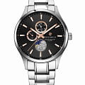 Мужские наручные часы Greenwich Moon Walker GW 058.10.35 представляют собой классический вариант для повседневной носки. Корпус из нержавеющей стали диаметром 43 мм с полезными функциями даты, дня недели и фаз Луны. Каждый индикатор, расположенный на черном матовом циферблате, выделен накладной рамкой. Индикатор в позиции «6 часов» украшает декоративный элемент с объемным рисунком, который напоминает кратеры на лунной поверхности. Минеральное стеклоМинеральное стеклоМинеральное стекло представляет собой искусственно выращенный минерал кварца. Такое стекло отличается особой устойчивостью к повреждениям и царапинам. Уступает по некоторым качествам сапфировому стеклу. защищает циферблат от царапин и обеспечивает отличную читаемость при любом освещении. Люминесцентное покрытиеЛюминесцентное покрытиеПозволяет считывать показания времени в темноте. Производители наносят на стрелки, часовые индексы, безель или поверхность циферблата светонакопительный состав, дающий холодное свечение. стрелок и меток позволит следить за временем даже в полной темноте. Стальной браслет на раскладной застёжкеРаскладная застёжкаТакой тип застёжки используется только на браслетах из металла. Она никогда не раскрывается полностью, происходит разделение на 2 и более частей. Раскладывающая застёжка снизит вероятность потери часов к минимуму. идеально дополняют дизайн часов, обеспечивая комфортное ношение. Класс водозащиты: 100 метров, позволит плавать, нырять и заниматься другими водными видами спорта.