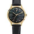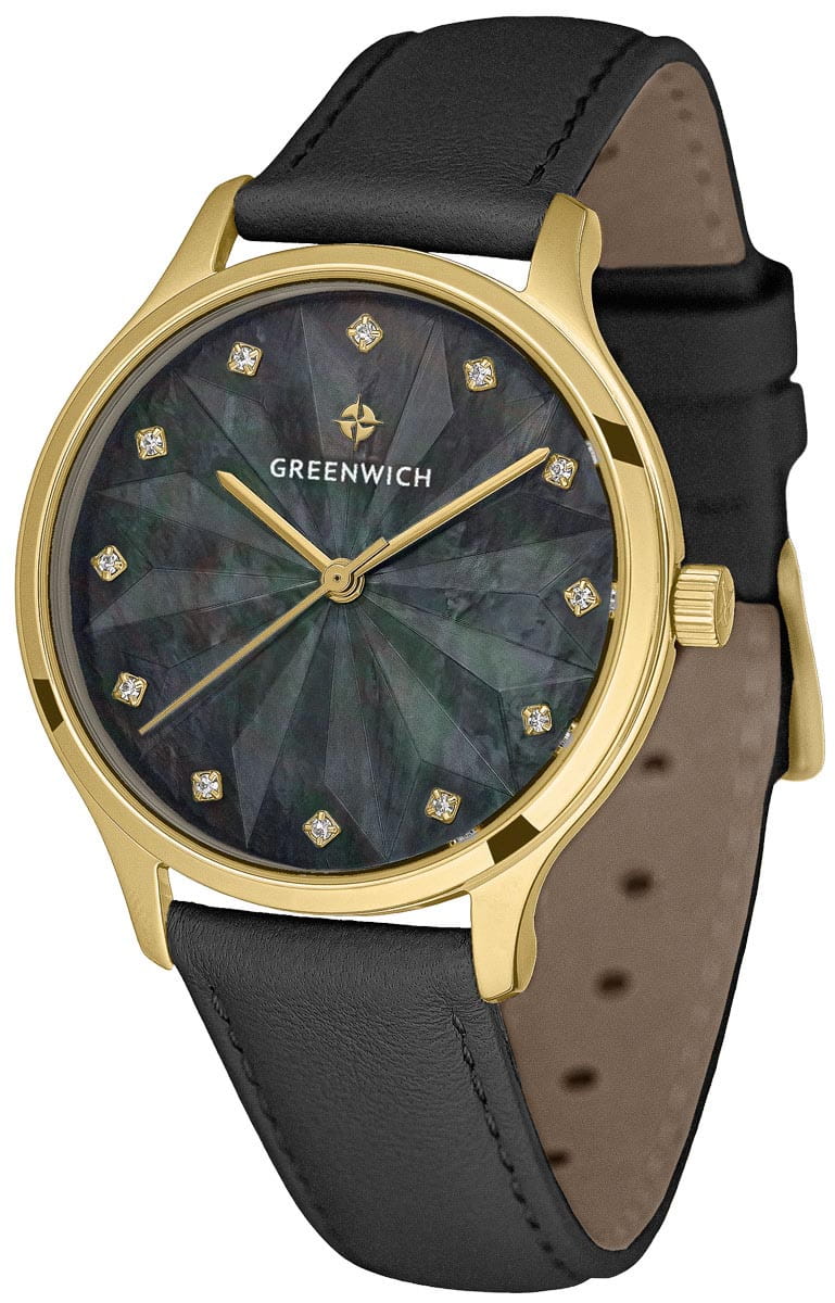 Женские английские часы с минеральным стекломМинеральное стеклоМинеральное стекло представляет собой искусственно выращенный минерал кварца. Такое стекло отличается особой устойчивостью к повреждениям и царапинам. Уступает по некоторым качествам сапфировому стеклу. Greenwich Callisto GW 341.21.51, кварцевый механизм с высокой точностью. Класс водозащиты: 50 метров, позволит защитить корпус от случайных брызг или капель дождя. Корпус часов изготовлен из стали с PVD-покрытиемPVDУльтратонкое покрытие наносится в технике вакуумного напыления, сочетает в себе нитрид титана особой прочности со слоем золота или оксида хрома. Несёт в себе декоративную или защитную функцию.. Кожаный ремешок на стандартной застёжке. Циферблат выполнен из натурального перламутра черного цвета с эффектной гравировкой: она напоминает звезду, сияющую на ночном небе. Фианиты надежно закреплены в кастах. Кварцевый механизм Miyota отвечает за точный ход стрелок: часовой, минутной и секундной.